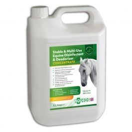 KILLS bacteria fungi & viruses including STRANGLES and RINGWORM within seconds. The disinfectant is fast acting and continues to work for a number of days after application. Aqueos is very powerful, has the same chemical hazard rating as water and is alcohol and bleach free. Can be used on any surface including rubber matting and safe to use in pressure washers and washing machines. Horses can return to treated areas immediately. Ideal for feed buckets, stables, yards horseboxes, quarantine areas and veterinarian premises and tested to British Standards EN1276 ,EN1650 & EN14476 Reduces risk of cross contamination as part of general stable hygiene regime. This 5 litre bottle dilutes to 200 litres of ready for use product.