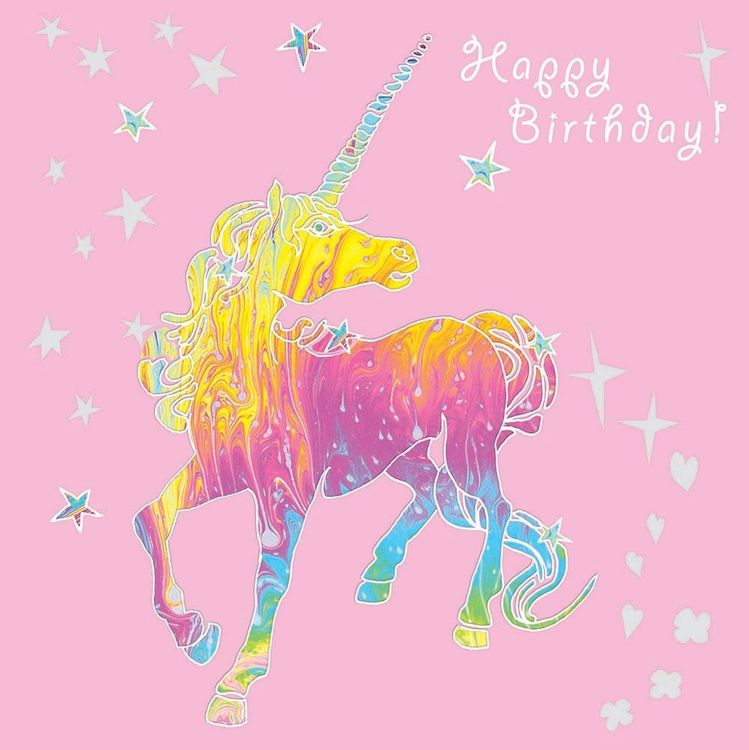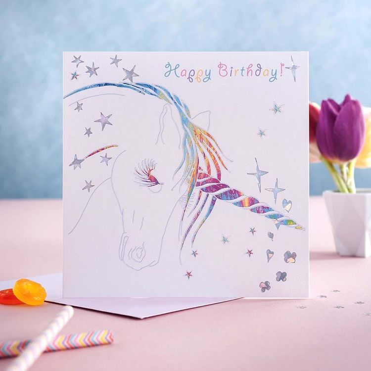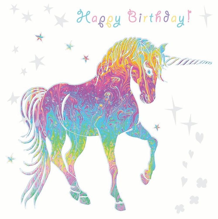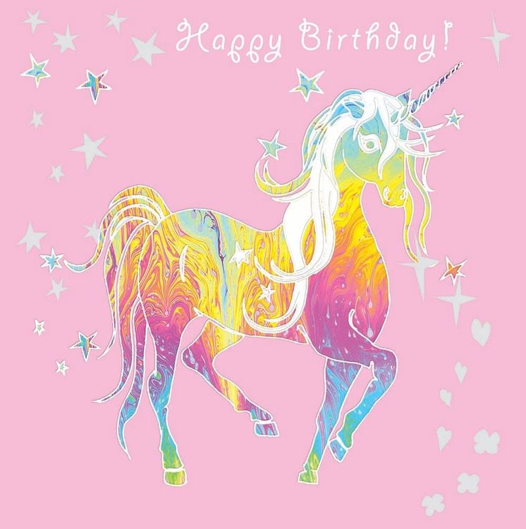 This super pretty unicorn birthday card is sprinkled with sparkling stardust and magic – perfect for little horse and unicorn lovers. The unique hand-illustrated pink greetings card features a brightly prancing unicorn with sparkly rainbow metallic foiled stars/hearts/flowers on the front, which also appear on the rear of the card. Blank inside for your own message. Individually cello wrapped.