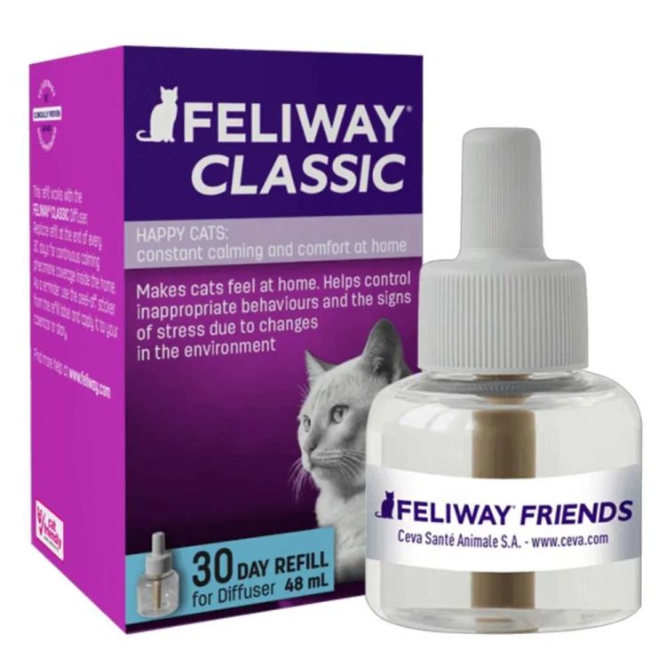 Feliway is a synthetic copy of the feline facial pheromone, used by cats to mark their territory as safe and secure. By mimicking the cat’s natural facial pheromones, Feliway creates a state of familiarity and security in the cat's local environment. As a result, Feliway can be used to help comfort and reassure cats, while they cope with a challenging situation and/or help prevent or reduce the stress caused to a cat during a change in their environment. Diffuser lasts about 4 weeks.