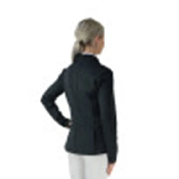 Designed for an active performance, this elegant fitted jacket is made from technical Flex-tech material to enable a full range of movement. The smart mesh overlay increases airflow to keep you cool and the technical stretch fabric is also quick drying. Four stunning diamante silver and black buttons fasten the jacket and the twin slits at the back ensure it sits correctly when you are in the saddle. The collar features subtle black diamantes on the trim which finish the look beautifully. Additional features include two front zipped pockets with silver YKK zips and contrasting mesh detail on the collar.