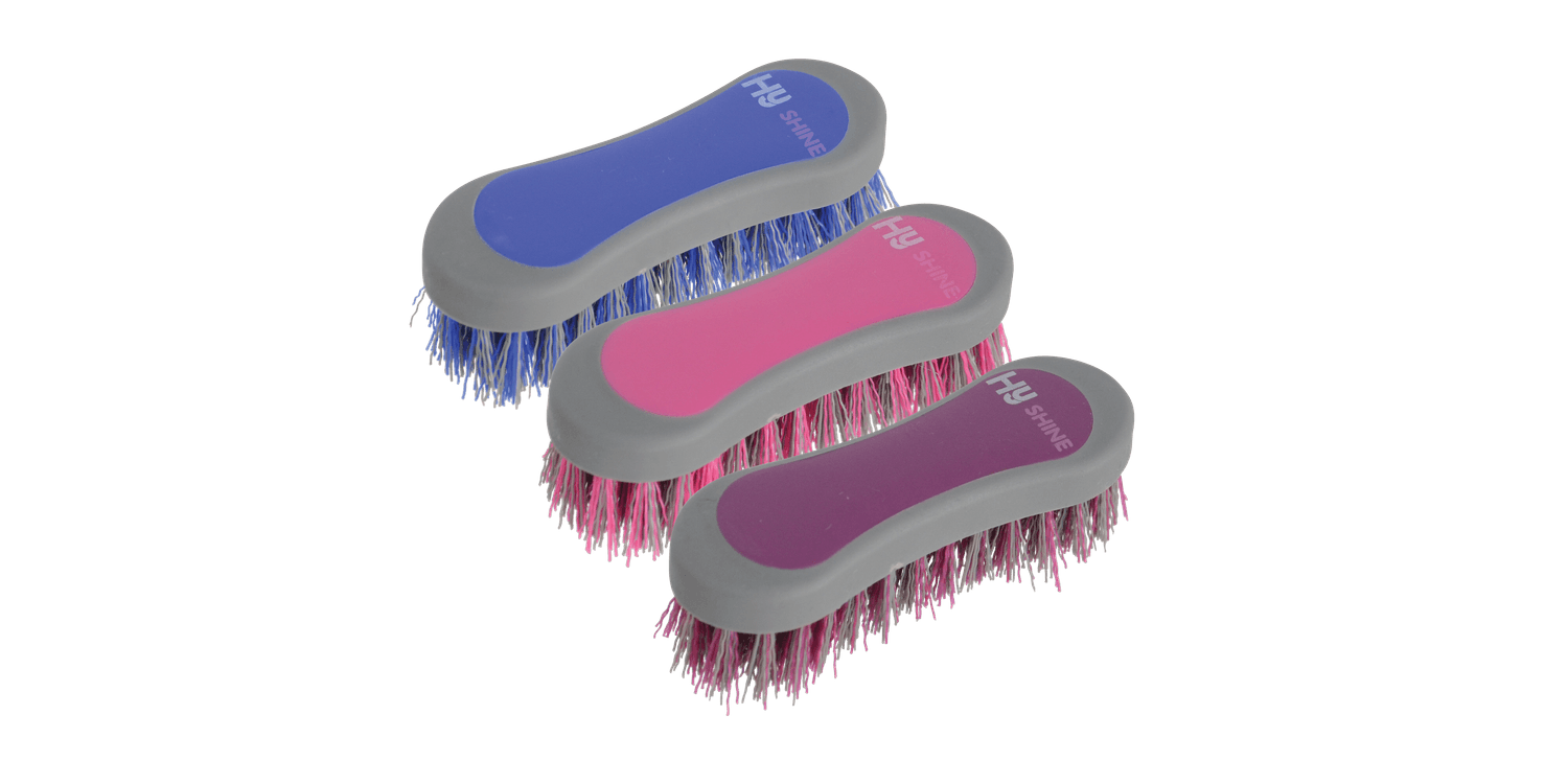 Two tone, soft touch hoof brush with stiff PP bristles.