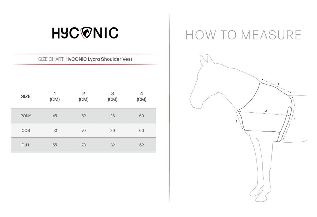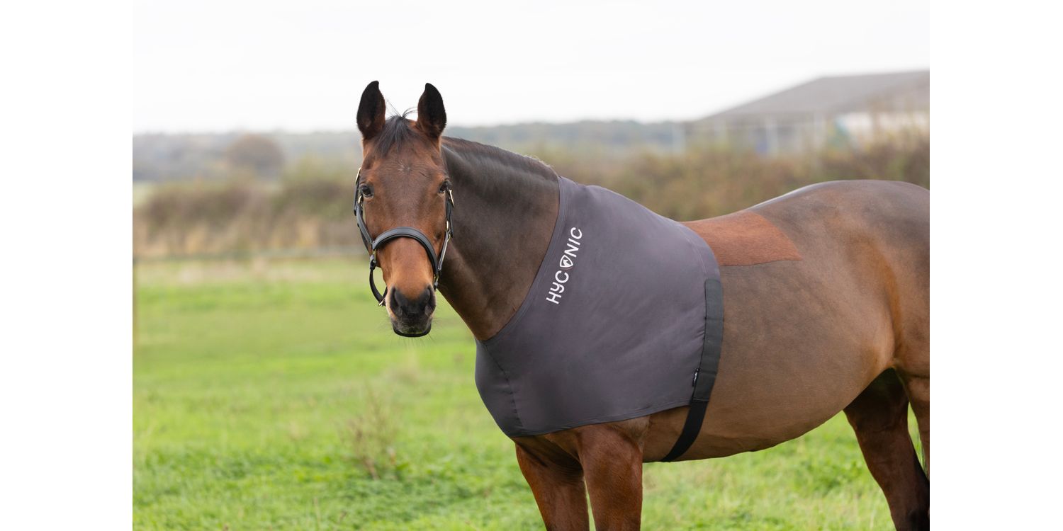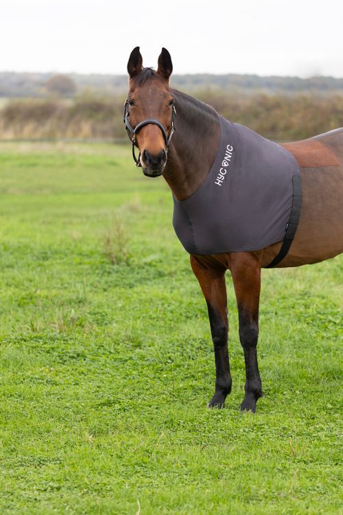 This close-fitting vest is perfect to help protect from rug rubs. The four way stretch offers a secure, comfortable fit around the withers, shoulder and chest. Slips on easily over the horses’ head and is fastened by an underbelly strap and touch tape fastening. Can be worn under stable or turnout rugs. Finished with HyCONIC logo.