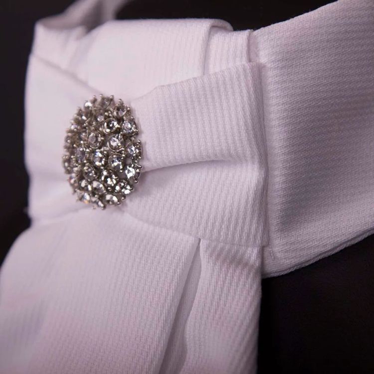 Pique fabric, hook and loop fastening with plenty of adjustment and single pleated tie with gem.