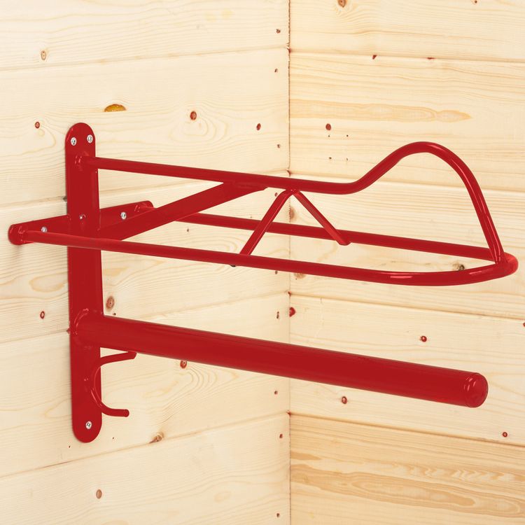 This is a longer version of our popular S19 Forward Seat Saddle Rack combined with a pole below for saddle pads and numnahs. This creates an air gap between saddle and pad which greatly aids drying. The extended length of the saddle rack also perfectly accommodates the larger western saddle. STUBBYFINE coated Red or Black.