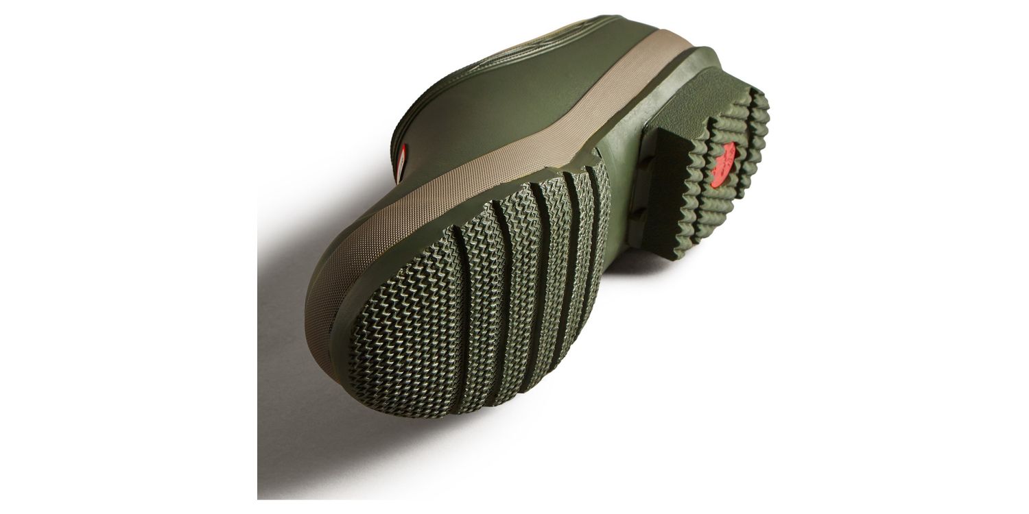 A dark green slip-on shoe handcrafted from waterproof vegan rubber, designed for gardening. Updated with the iconic red box logo, the clog has a flexible natural rubber form and Hunter's signature tread providing grip.