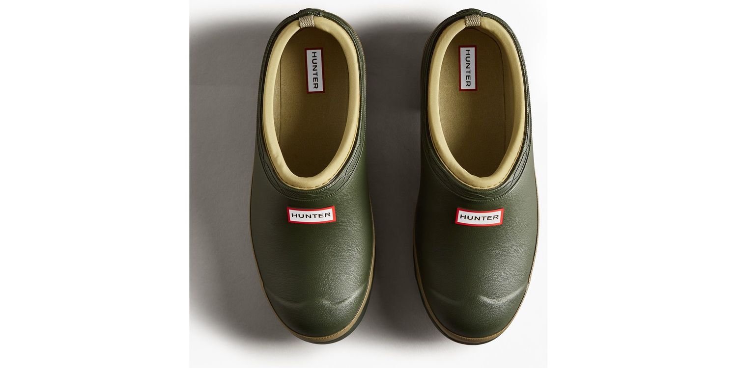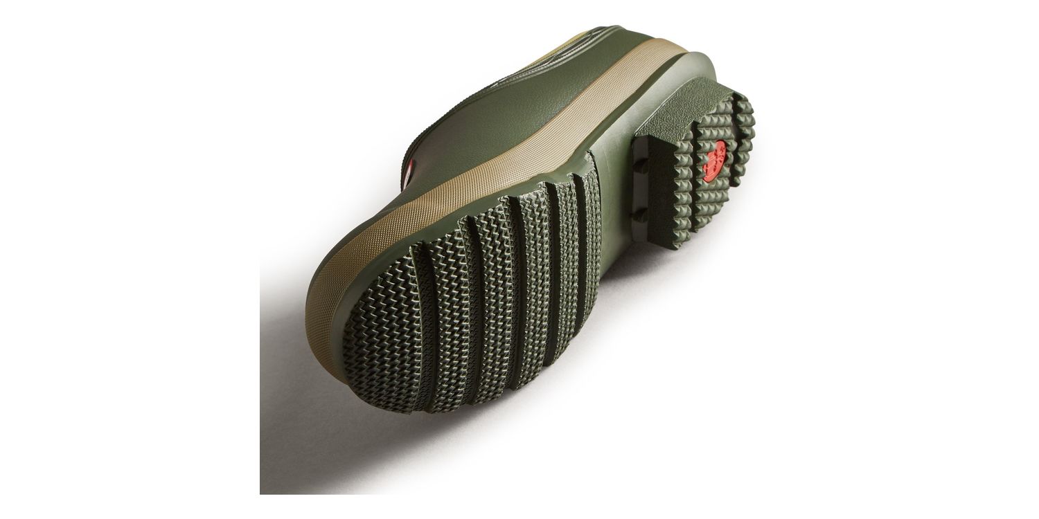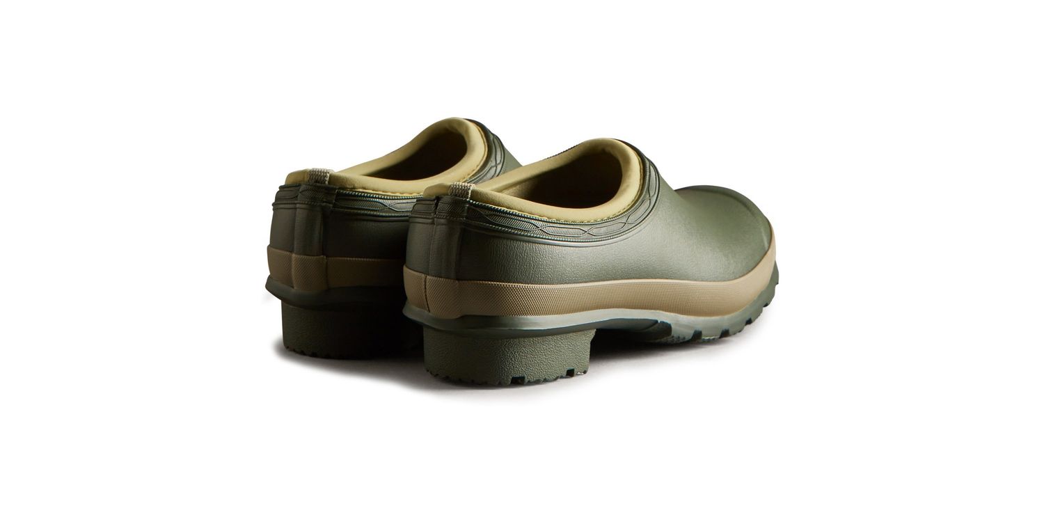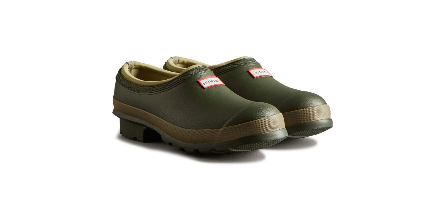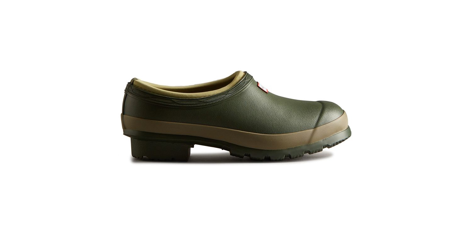 A dark green slip-on shoe handcrafted from waterproof vegan rubber, designed for gardening. Updated with the iconic red box logo, the clog has a flexible natural rubber form and Hunter's signature tread providing grip.