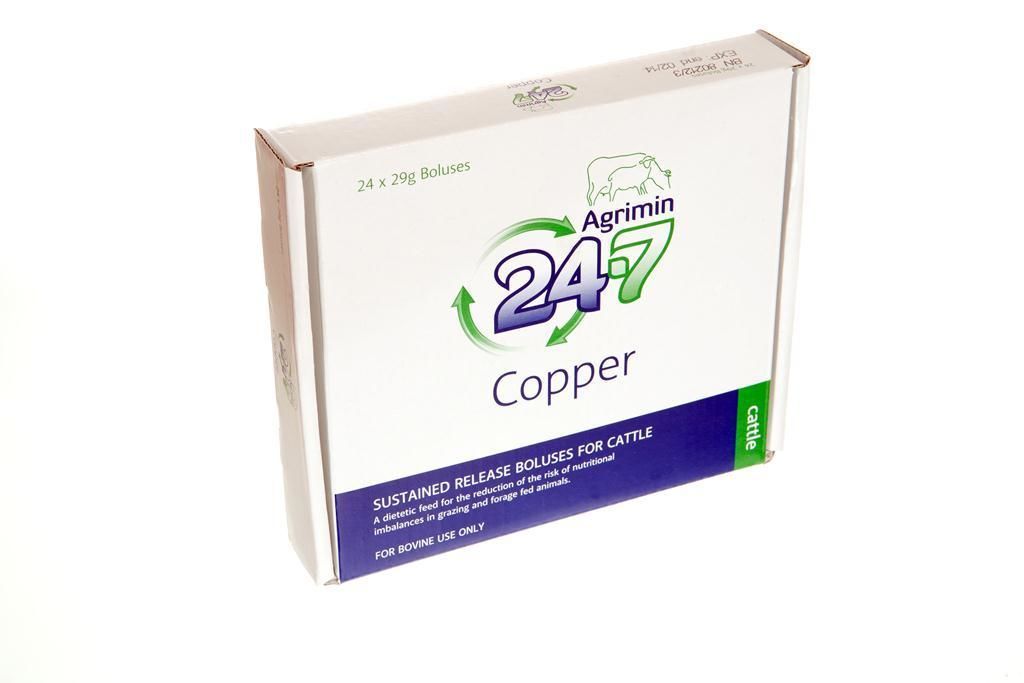 A sustained release bolus containing copper, intended for growing cattle and breeding cows on grass or forage-based diets. Designed for situations where soil and forage copper levels are low or where known copper antagonists such as molybdenum, iron and sulphur are high. Each bolus contains 25gm of copper oxide rods, equivalent to 21.25gm of copper. To be used with applicator AGR0205.