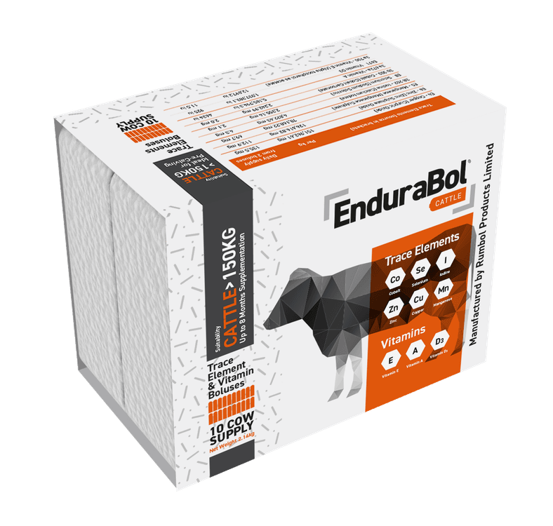 EnduraBol Cattle is a sustained release bolus containing six trace elements and three vitamins. EnduraBol Cattle is designed for grazing or forage fed cattle, helping farmers manage the trace element status of their herd