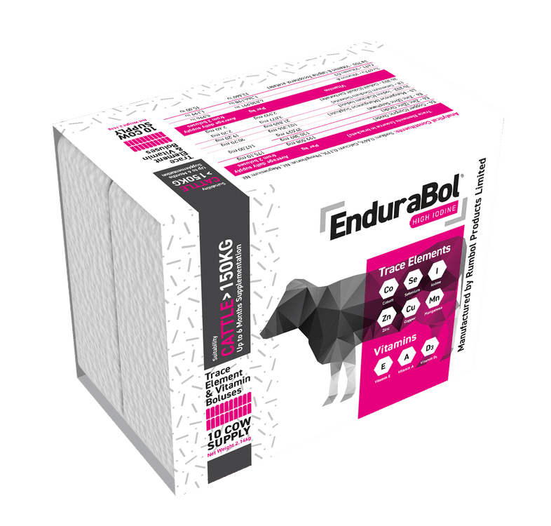 EnduraBol High Iodine is a sustained release bolus containing six trace elements and three vitamins. Endurabol High Iodine is designed for grazing or forage fed cattle, helping farmers manage the trace element status of their herd.