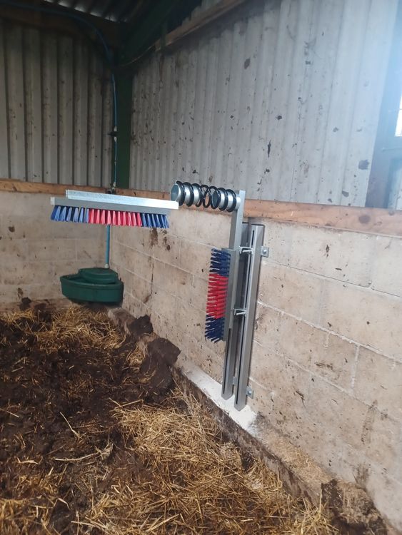 Designed to mount securely to stall walls, posts, or corners, this dual-brush system allows cattle to groom themselves naturally, helping reduce itching, remove loose hair and dirt, and promote healthier coats.