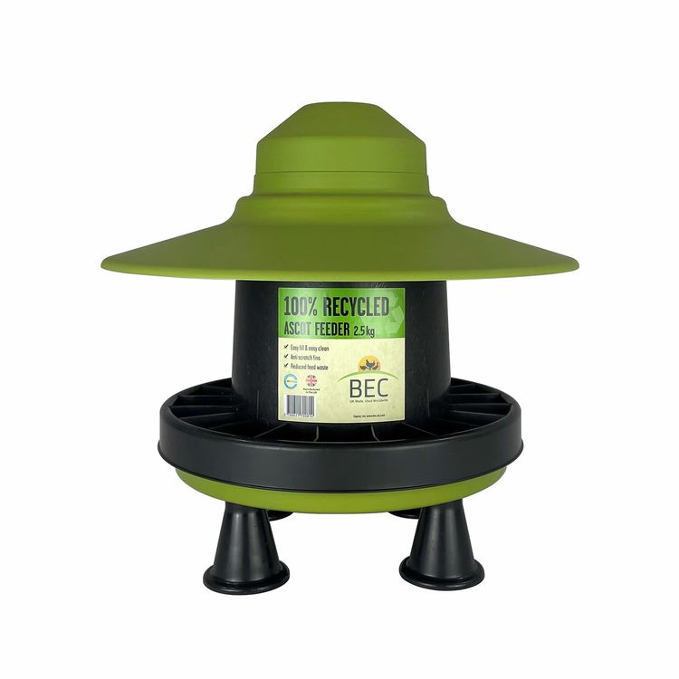 Adaptable for use with free range birds as well as birds that are kept in a more confined environment, the compact design allows its use in even the smallest coops where space is limited. The feeder can be raised 5.8cm off the ground with the standard conical feet. Made from 100% recycled material.