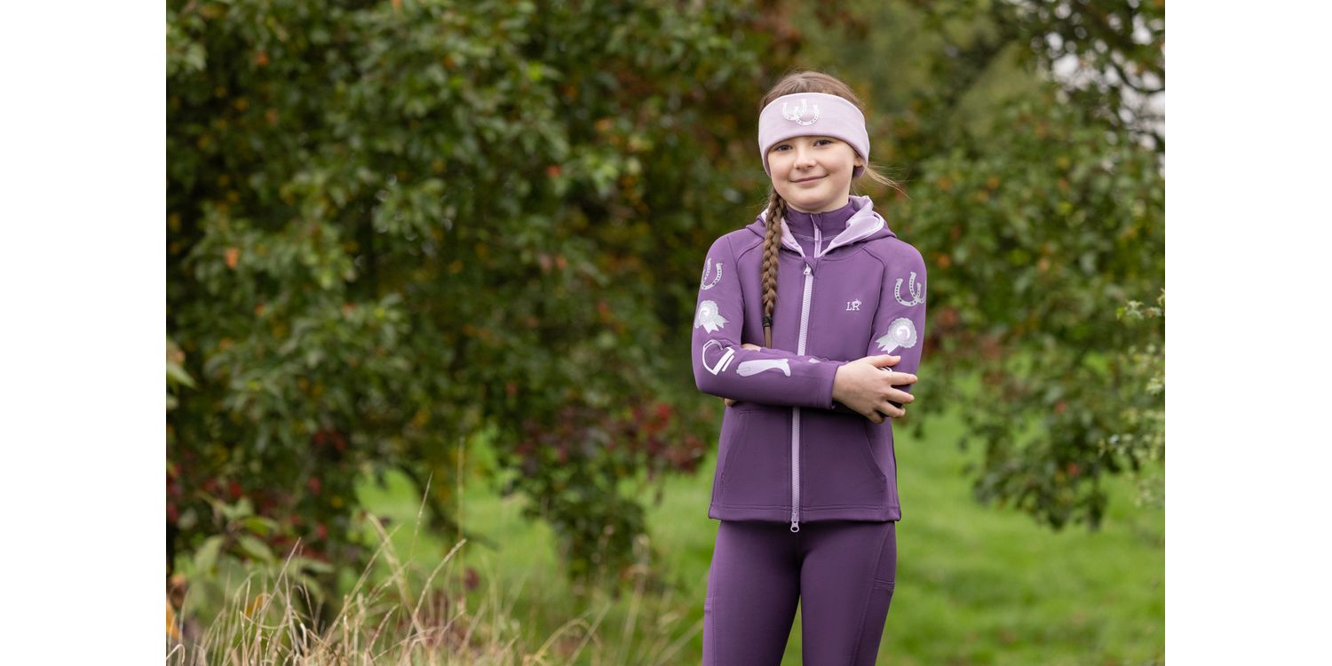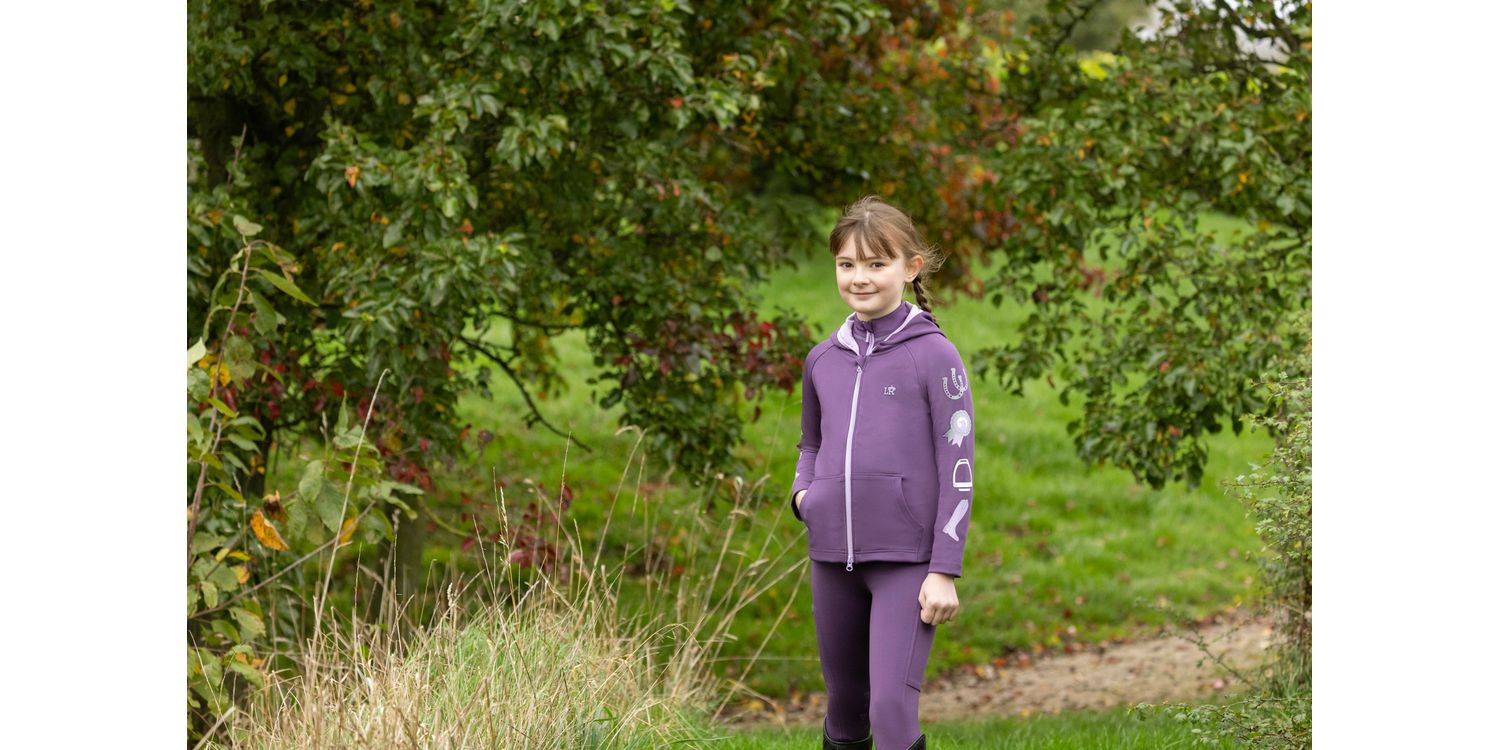 This smart jacket offers the ultimate in flexibility and comfort as the soft fabric is lightweight and quick drying, featuring equestrian themed print down each arm. A two-way zip is easily adjusted in the saddle or on the yard and two front pockets provide useful storage. This smart jacket with hood will protect your little one from the elements, thanks to the windproof and showerproof outer. Finished with coordinating stitching and Little Rider emblem to the chest. Part of the Giddy Up Gymkhana collection.