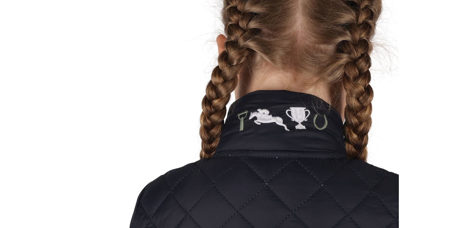 Add a dash of country chic to your Little Rider's wardrobe with the Pony Passion Quilted Jacket. Perfect for days out in the countryside, out pony riding or even for school - the light quilting makes this the ideal layer for cooler mornings and evenings. Available in navy for a smart appearance, the lining features the Pony Passion print for a modern twist. Finished with tonal front zip, two press stud front pockets and embroidered Pony Passion emblems to the back of the collar.