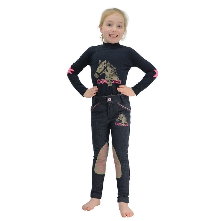 These stylish denim look jodhpurs are the ultimate in comfort and fashion, whilst being perfect for riding. Reinforced Alos knees are enhanced with pink silicon hearts and horseshoes for added grip, with the bi-stretch material offering perfect fit. The Riding Star pony print to the front of the jodhpurs is complemented by the logos on the rear pockets, and the jodhpurs are finished with a pink and navy stitch to the front pockets that also runs along the rear of the jodhpur. Easy to care for, machine washable and comfortable, these jodhpurs are the perfect choice for the active rider!