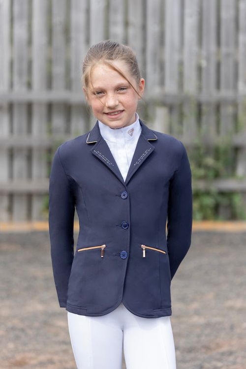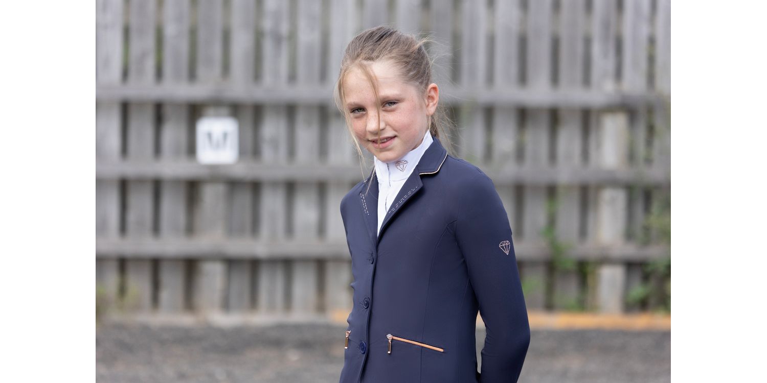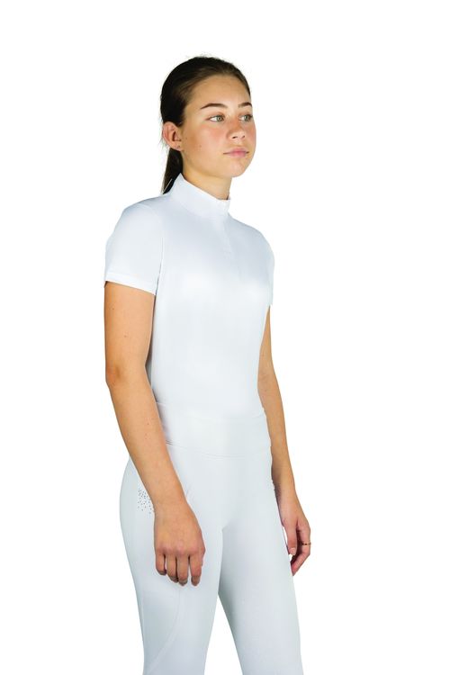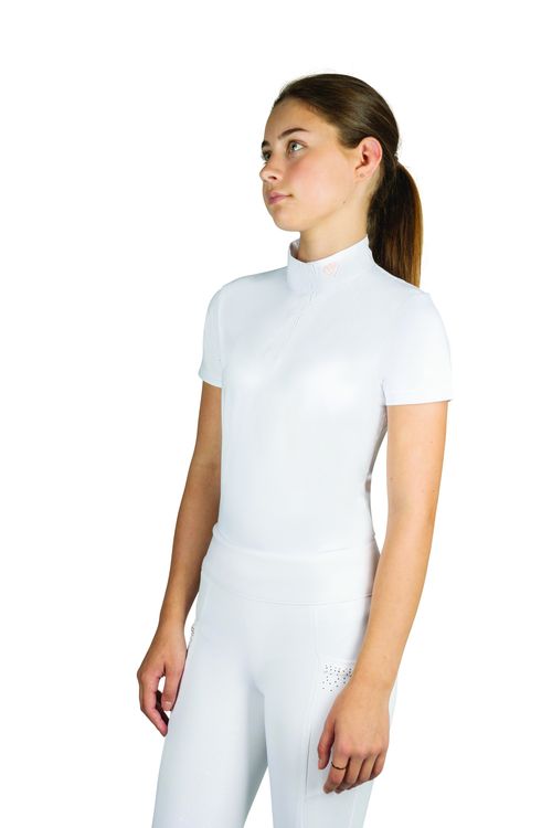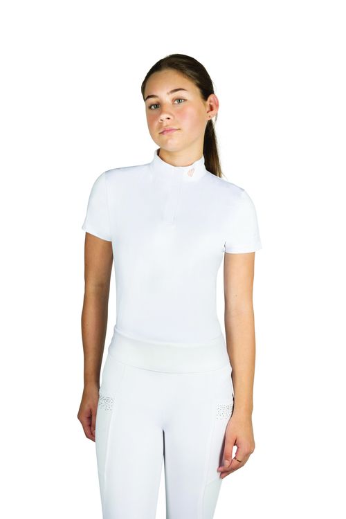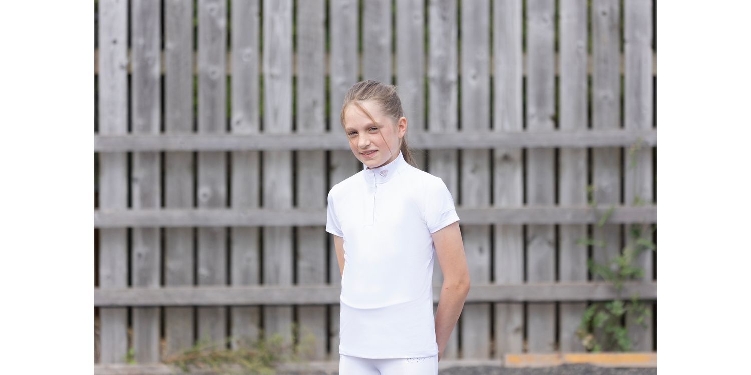 This striking white children’s show shirt will complete any show outfit. With the beautiful diamond shape made from diamantes on the neck you will be sure to turn heads! Featuring the Hy Equestrian logo on the centre of the sleeve and shiny thread detailing.