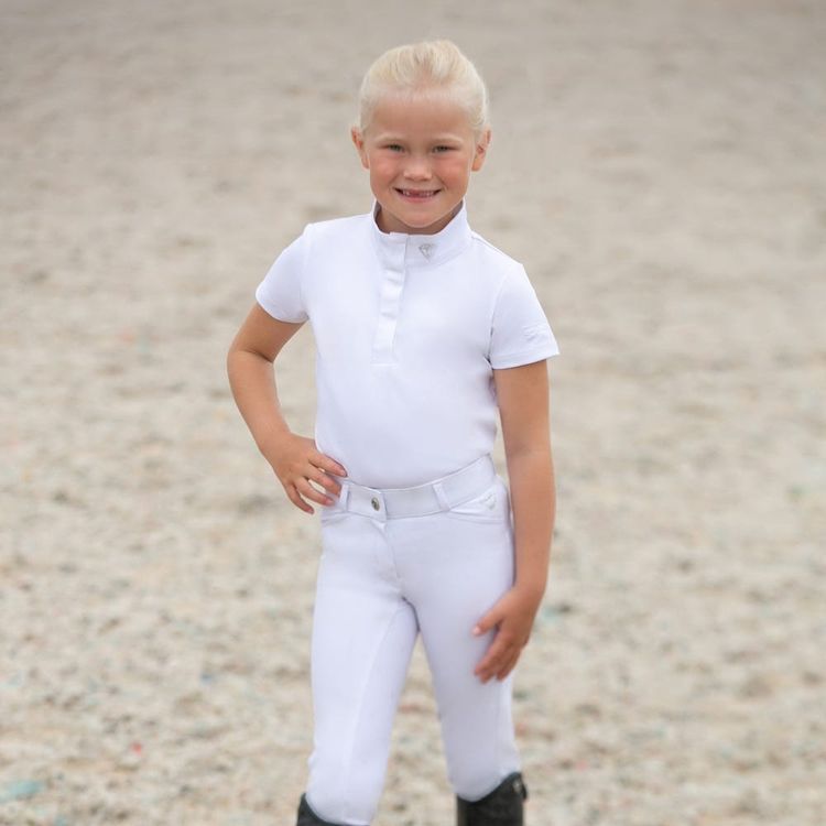 This striking white children’s show shirt will complete any show outfit. With the beautiful diamond shape made from diamantes on the neck you will be sure to turn heads! Featuring the Hy Equestrian logo on the centre of the sleeve and shiny thread detailing.