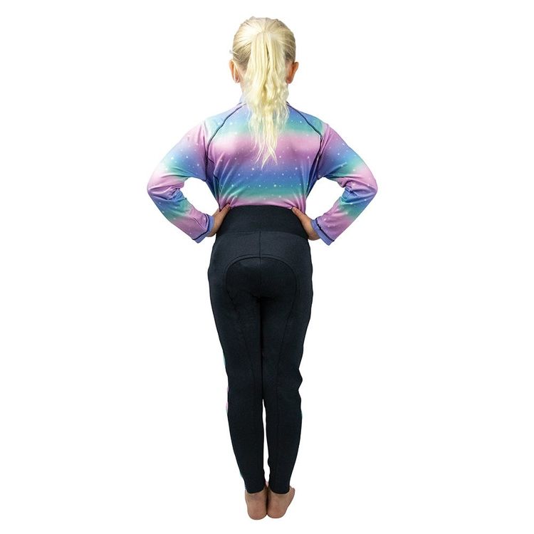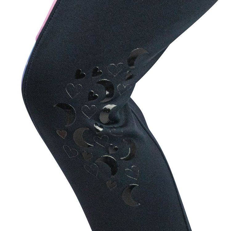 Let your Little Rider dazzle in these magical navy riding tights with Dazzling Night Prismatic print panels on the legs. Made from a flexible, stretch material, ensuring a snug fit for days in and out the saddle and to optimise comfort. The silicone moon and heart knees in subtle navy not only look good but help with grip when riding. Featuring a handy phone pocket for possessions, Little Rider logo and elasticated waistband for ease of fit and comfort. Match with the rest of the collection.
