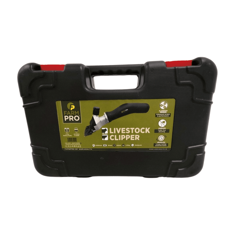 The new Farm Pro cordless Livestock clipper. Can be used to clip both sheep and cattle. A high performance machine with enhanced torque and unique planetary gearing system. Brushless motor for reliability. 2400 rpm. Two Li-ion cartidge batteries included with a run time of up to 60 minutes each and 90 minute re-charge. Lightweight 1.35kg. 12 month warranty.