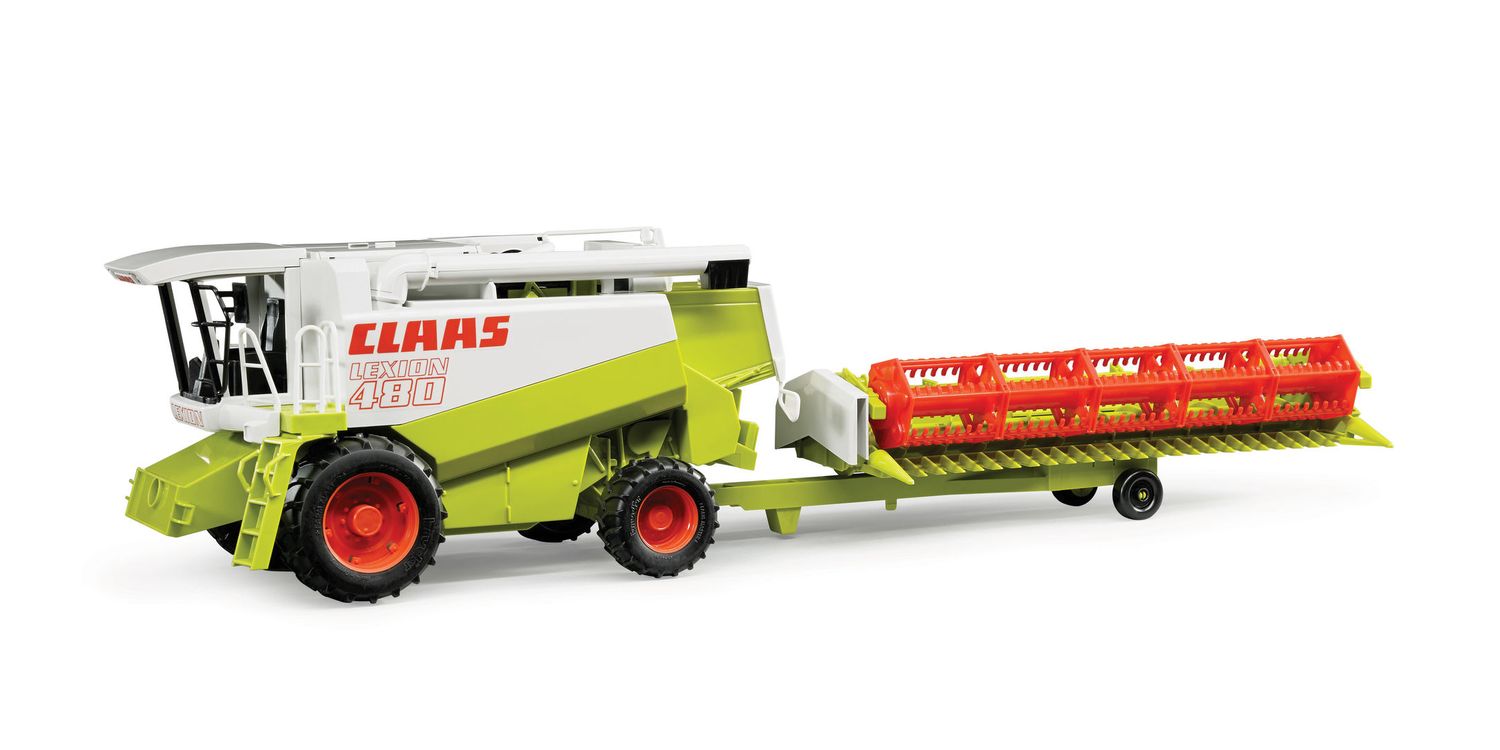 The Bruder Claas Lexion 480 Harverster has a moving, detachable mowing device, with a draw-in roller that can be tilted up and locked into position.  It also has a movable straw chopper, grain pipe that swivels and grain bin flap and hatch that opens.