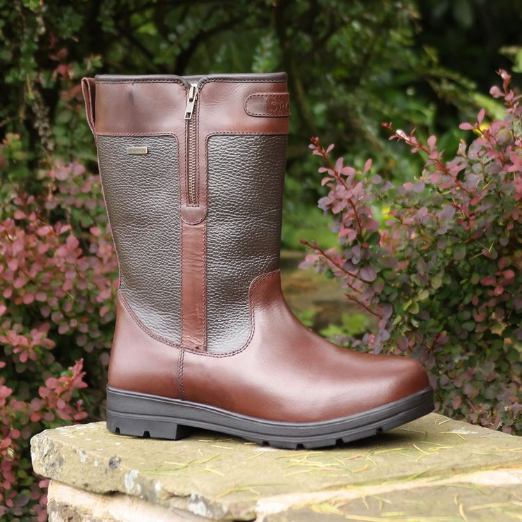 Practicality at the yard, yet comfortable and stylish enough for casual wear! Features a concealed waterproof membrane to keep feet dry and warm, a technical mesh lining wicks away perspiration and keeps feet comfortable in warmer weather, genuine smooth leather foot and textured leather ankle and calf for a classic country look, chic Brogini embossed badge on the front of the boot and brass detailing, textured, durable rubber sole offers excellent grip and stability when walking, functional side zipper allows for wider calves and comfort when walking.