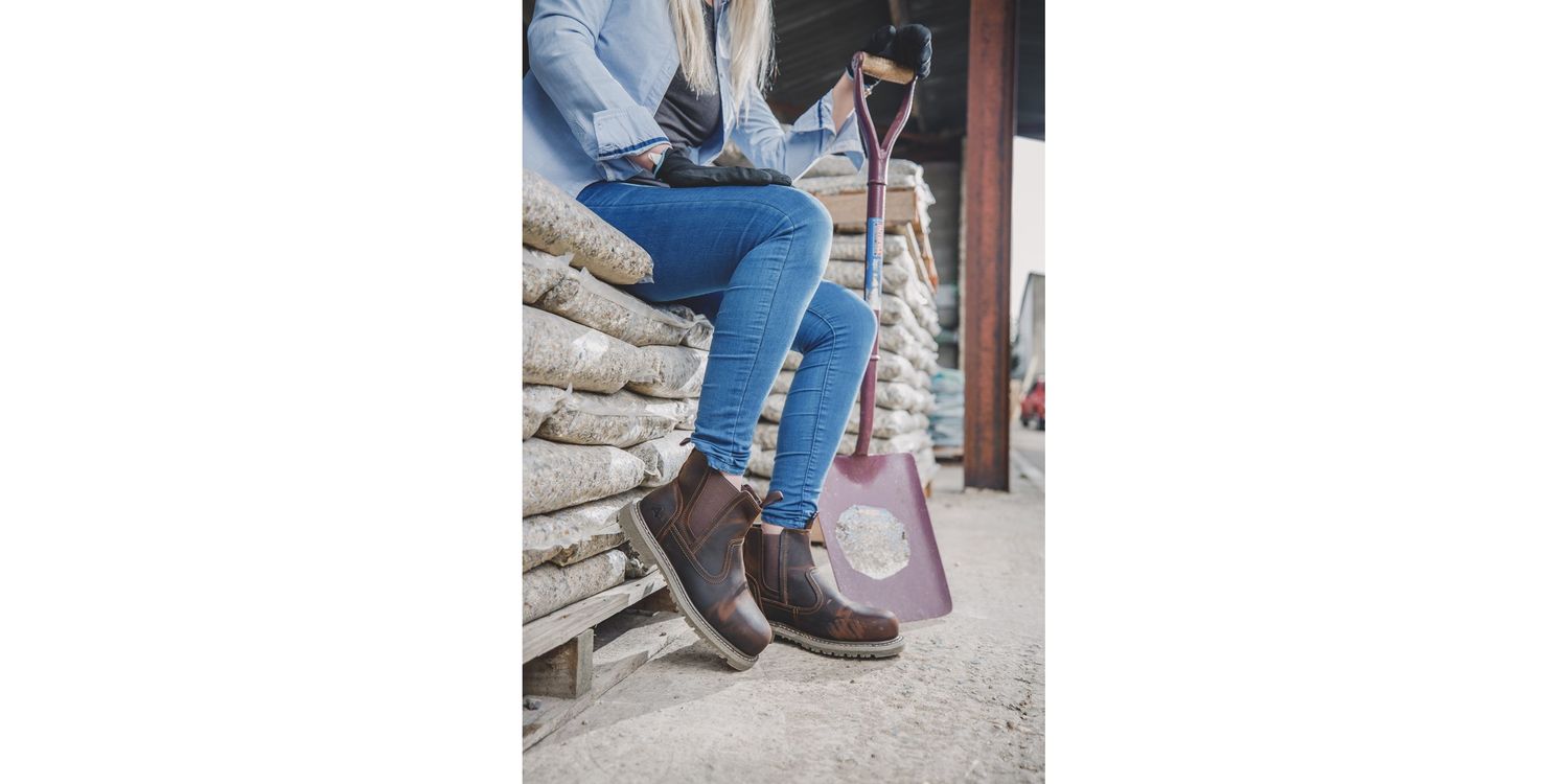 Ladies modern Goodyear Welt safety dealer boot crafted with Leather, has a Steel Toe cap, pull on loops for ease along with twin elastic gussets, Nitrile Rubber outsole with energy absorbing heel for comfort. Safety standard EN ISO 20345:2011 - SB