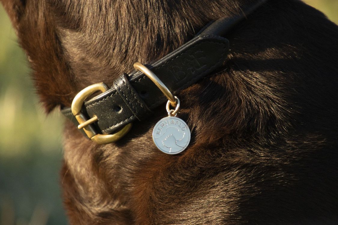 A sleek rolled leather collar that is guaranteed to keep your dog comfortable. Featuring robust hardware for durability and longevity. Includes a gorgeous Benji & Flo matching dog tag to engrave your dog’s name on. The adjustable buckle design ensures a perfect fit every time. Before purchasing, please view our size guide to ensure you get the best possible fit for your dog. We also recommend that you must be able to fit two fingers between the collar and the neck. Replace collar at the first sign of damage. Complete the look with a matching lead, choose from Black/Brass or Tan/Rose Gold.