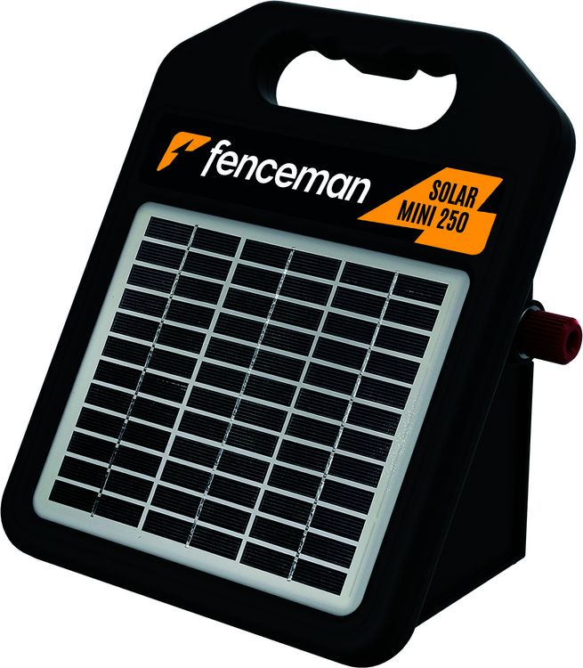 Fenceman Mini 250 solar energiser. 0.25J. Has two modes - auto and night. Comes with black and red leads and earth stake.Can be mounted on a wooden stake. Can be re-charged by a 12v battery charger.