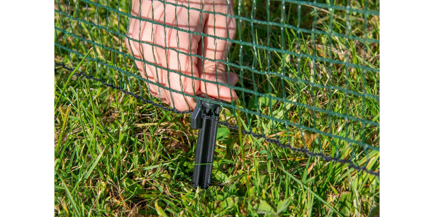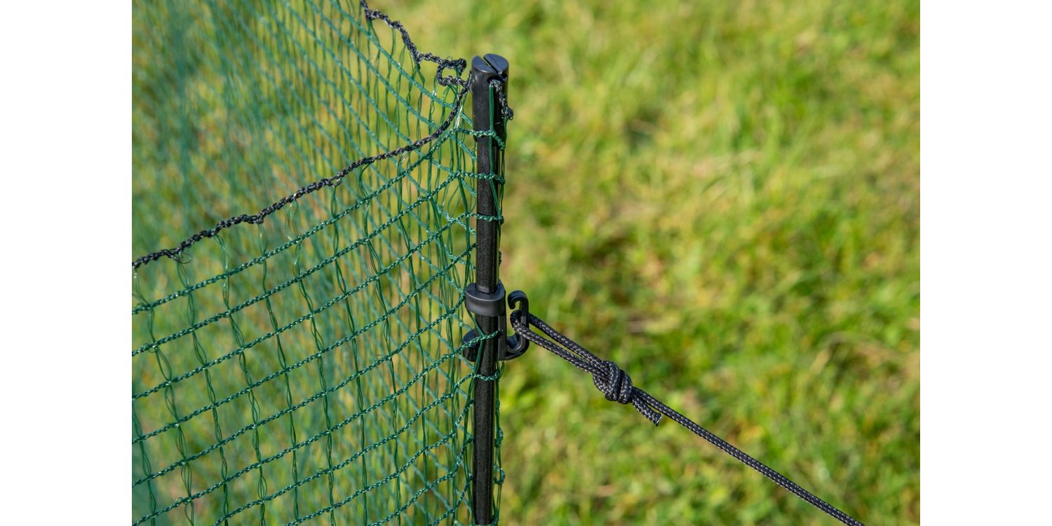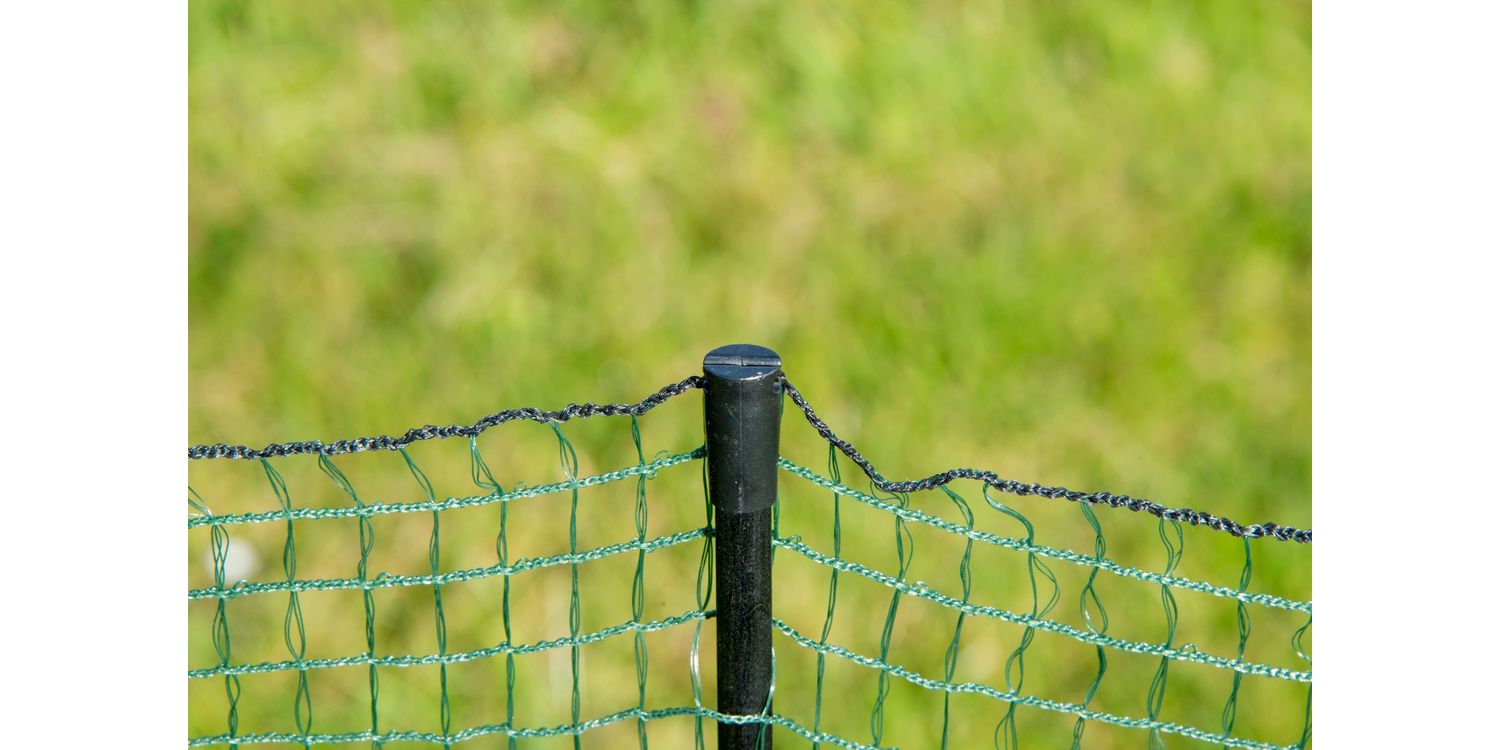 Thanks to the 12 integrated fibreglass st akes, the net remains stable and solid. 12 fibreglass posts on 20 m net length means one post every 1,81 m. This small post spacing makes the FIX boundary fence unique in the horizont range! Furthermore, the 10 cm long individual spikes support the stable stand of the net. The small mesh spacing of 17x17 mm is also an indicator of stability and quality.