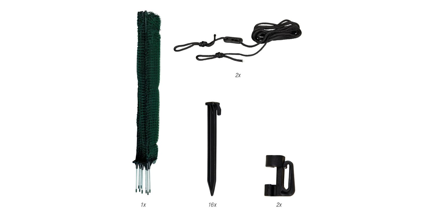 - 1x FIX boundary fence, 2x clip insulators, 2x tension ropes and 16x small pegs