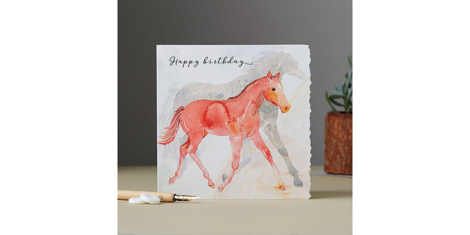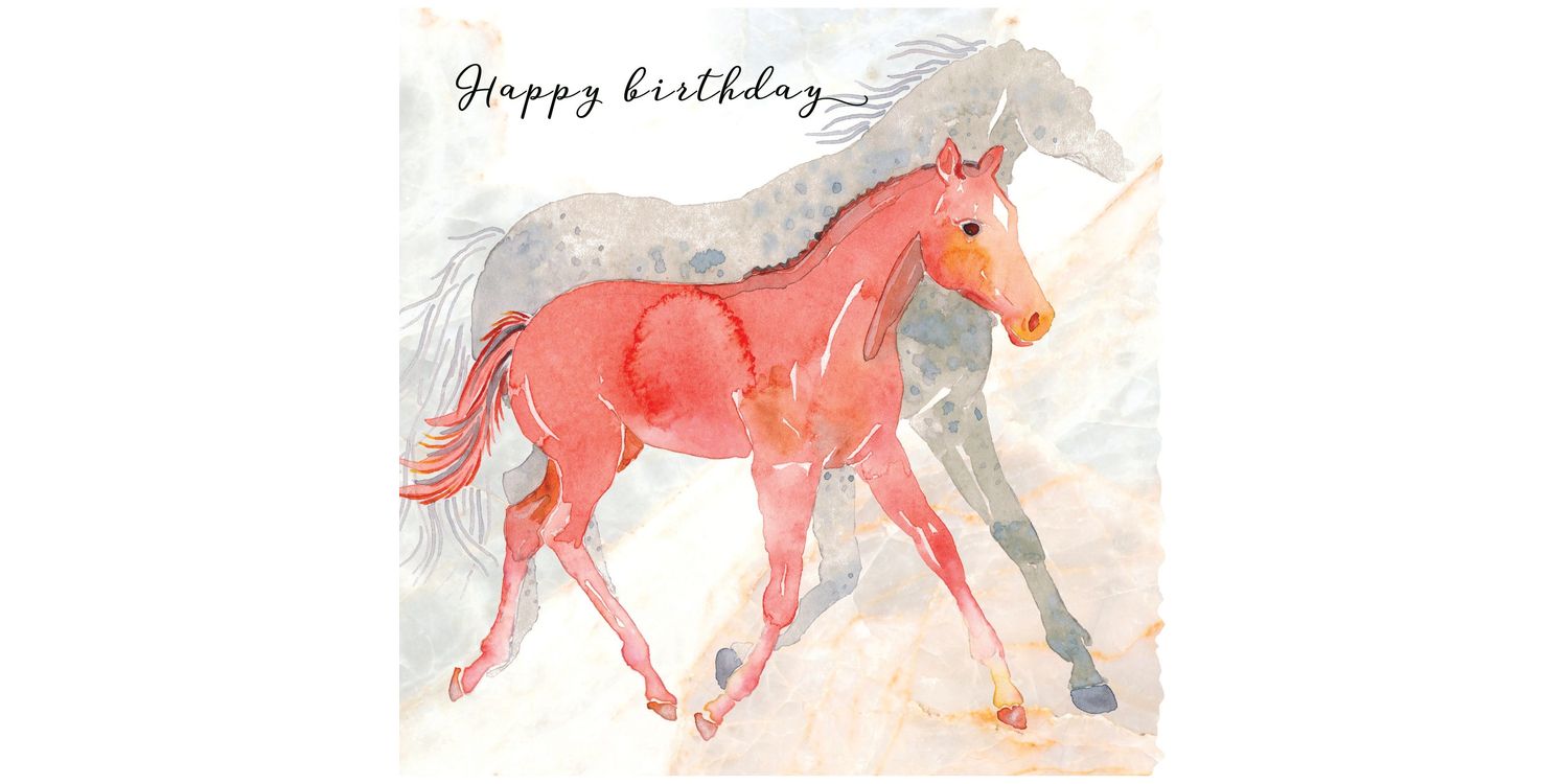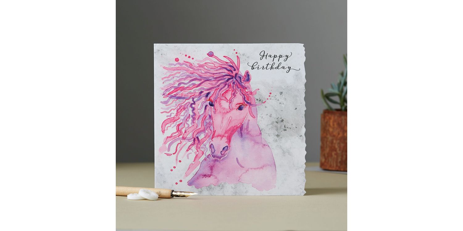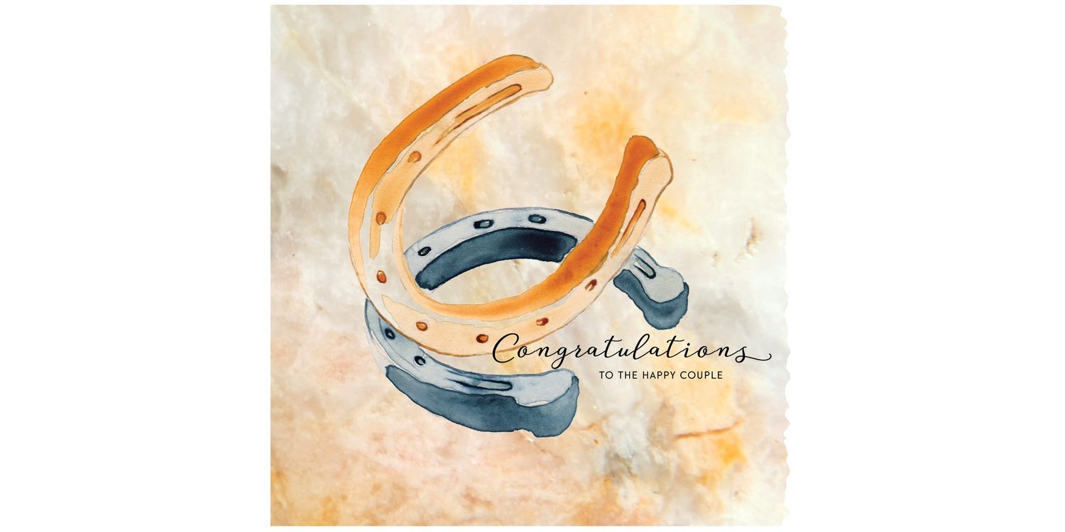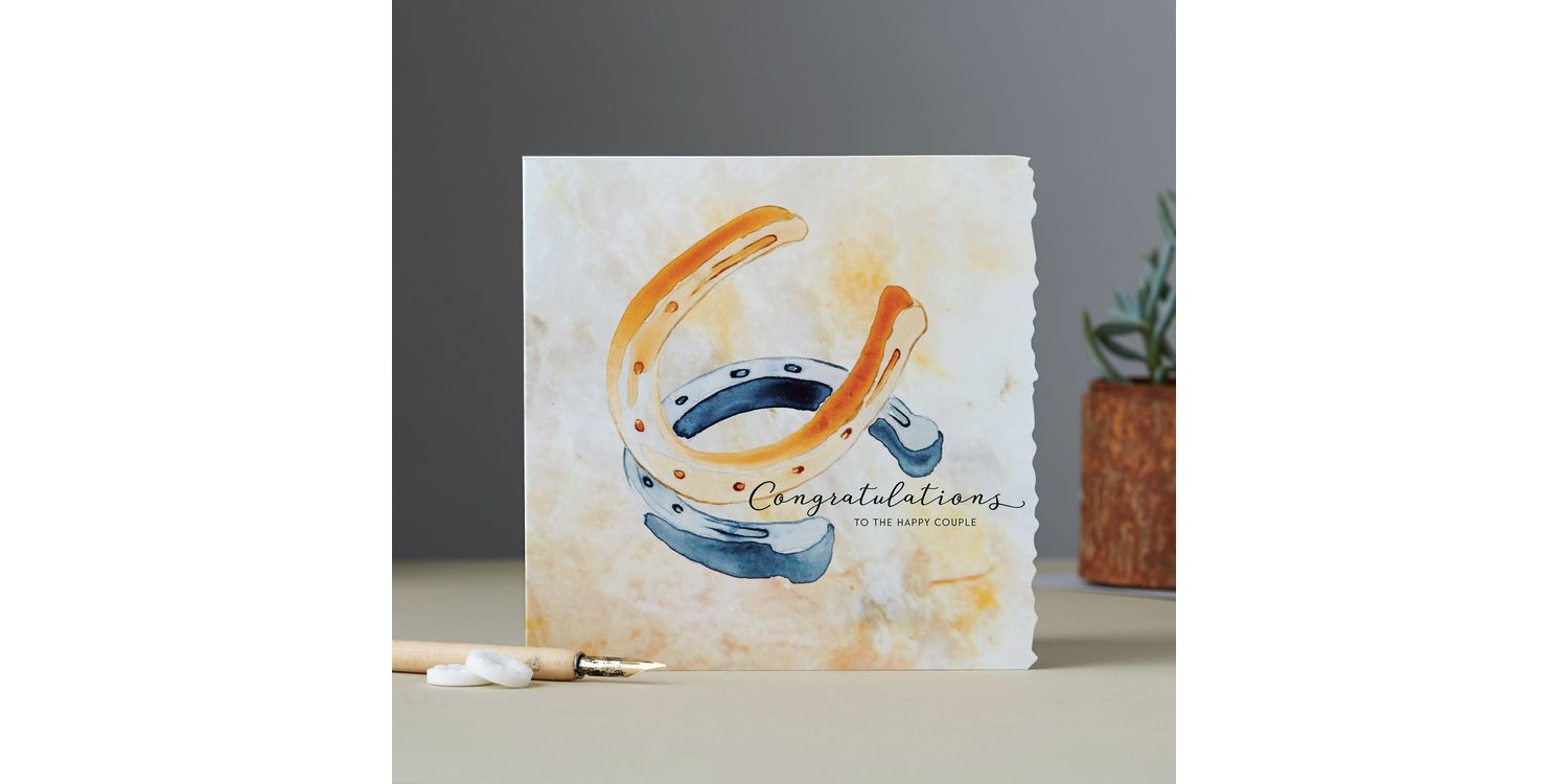 Card: 150x150mm sq, Blank inside. Envelope: 155mm sq, grey. Individually cello wrapped. Made in the UK.Front: Happy Anniversary. Best wishes on this special day. Finish: Outer gloss varnish, Die-cut to the edge.Featuring an original hand-painted watercolour design of two horse shoes entwined as hearts, enhanced with a marble background with a unique die-cut edging.