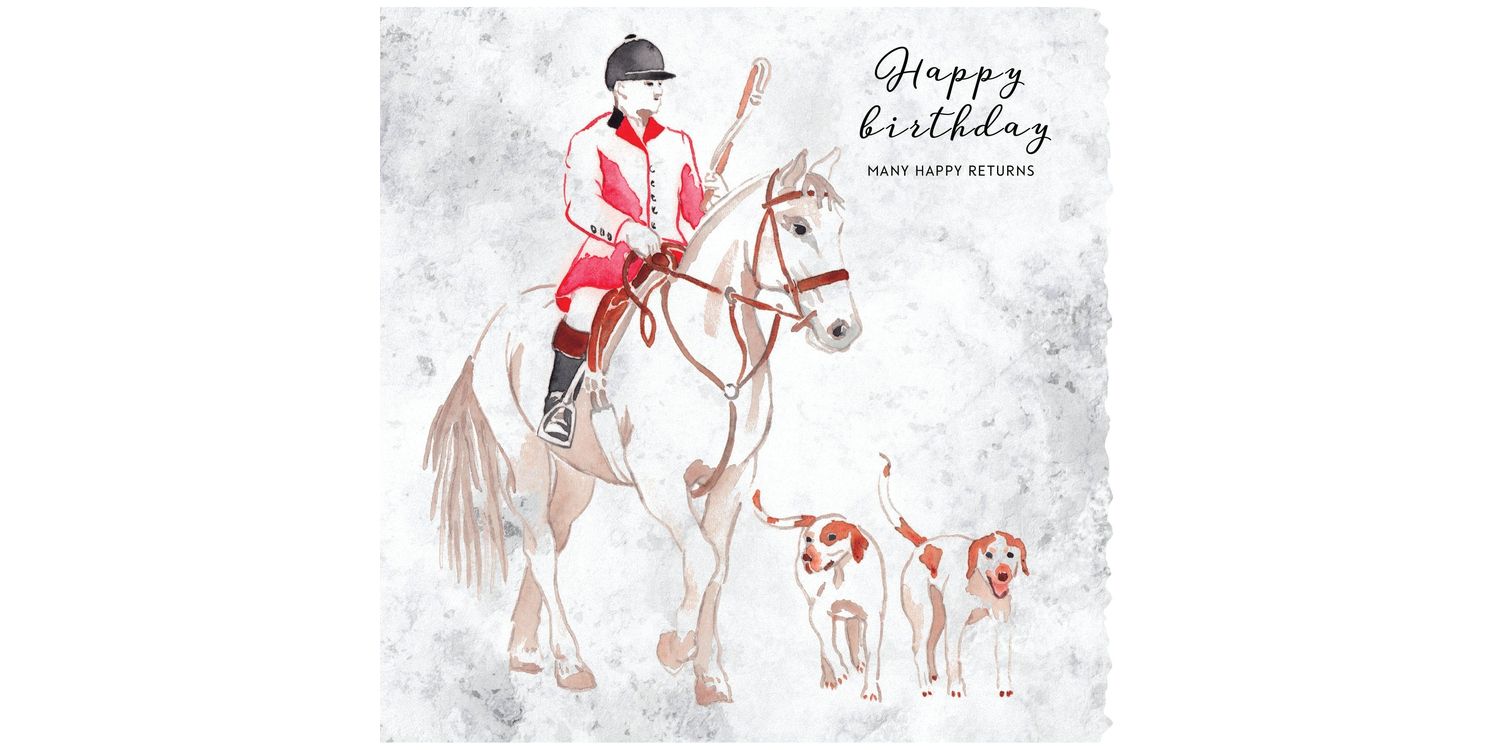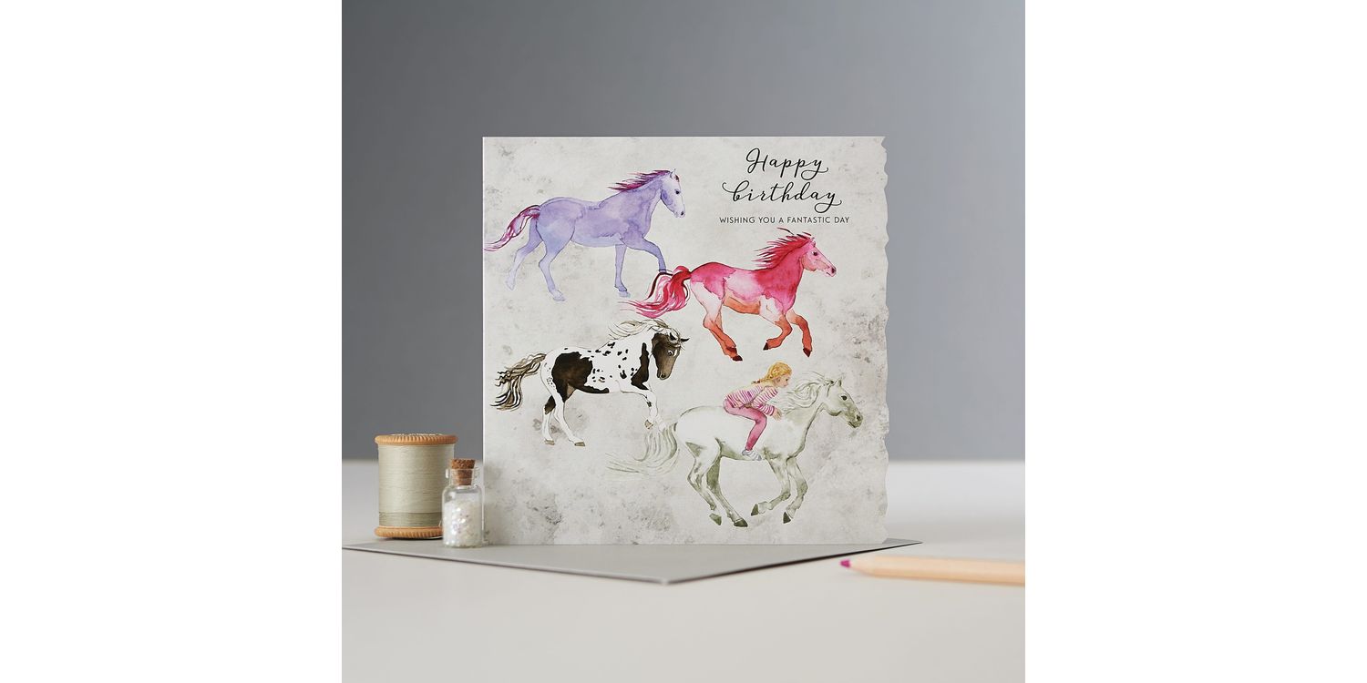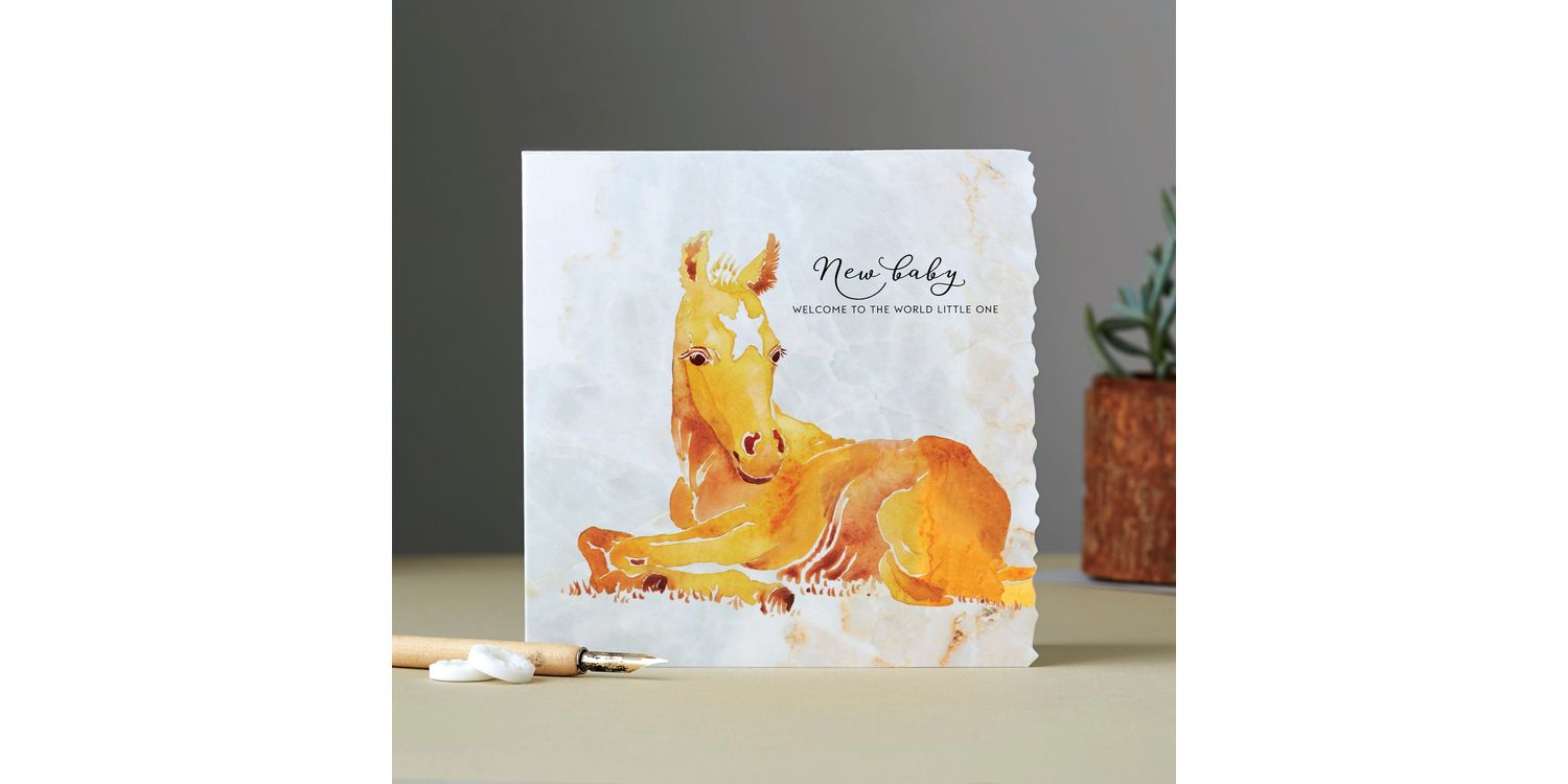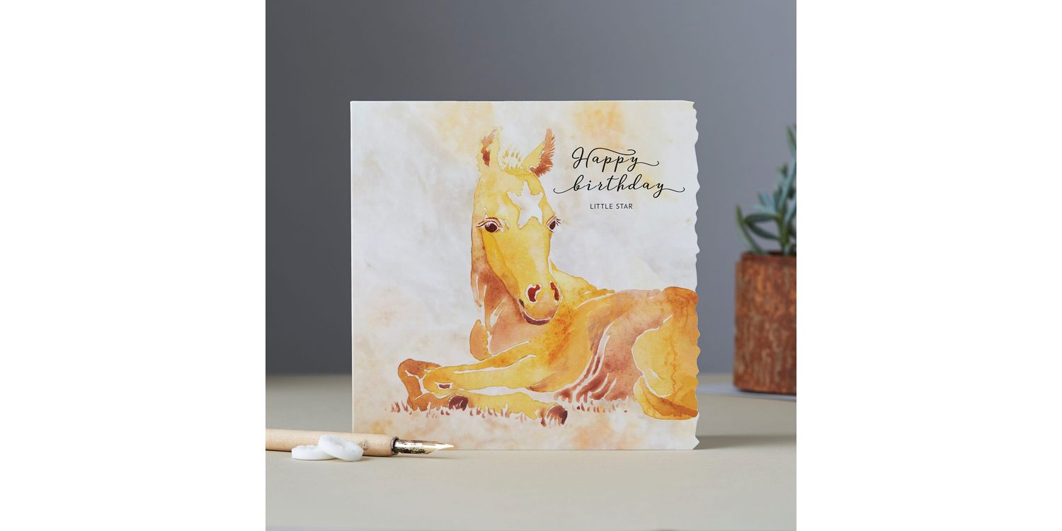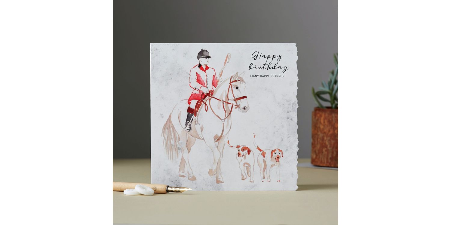 Card: 150x150mm sq, Blank inside. Envelope: 155mm sq, grey. Individually cello wrapped. Made in the UK.Front: Happy Anniversary. Best wishes on this special day. Finish: Outer gloss varnish, Die-cut to the edge.Featuring an original hand-painted watercolour design of two horse shoes entwined as hearts, enhanced with a marble background with a unique die-cut edging.