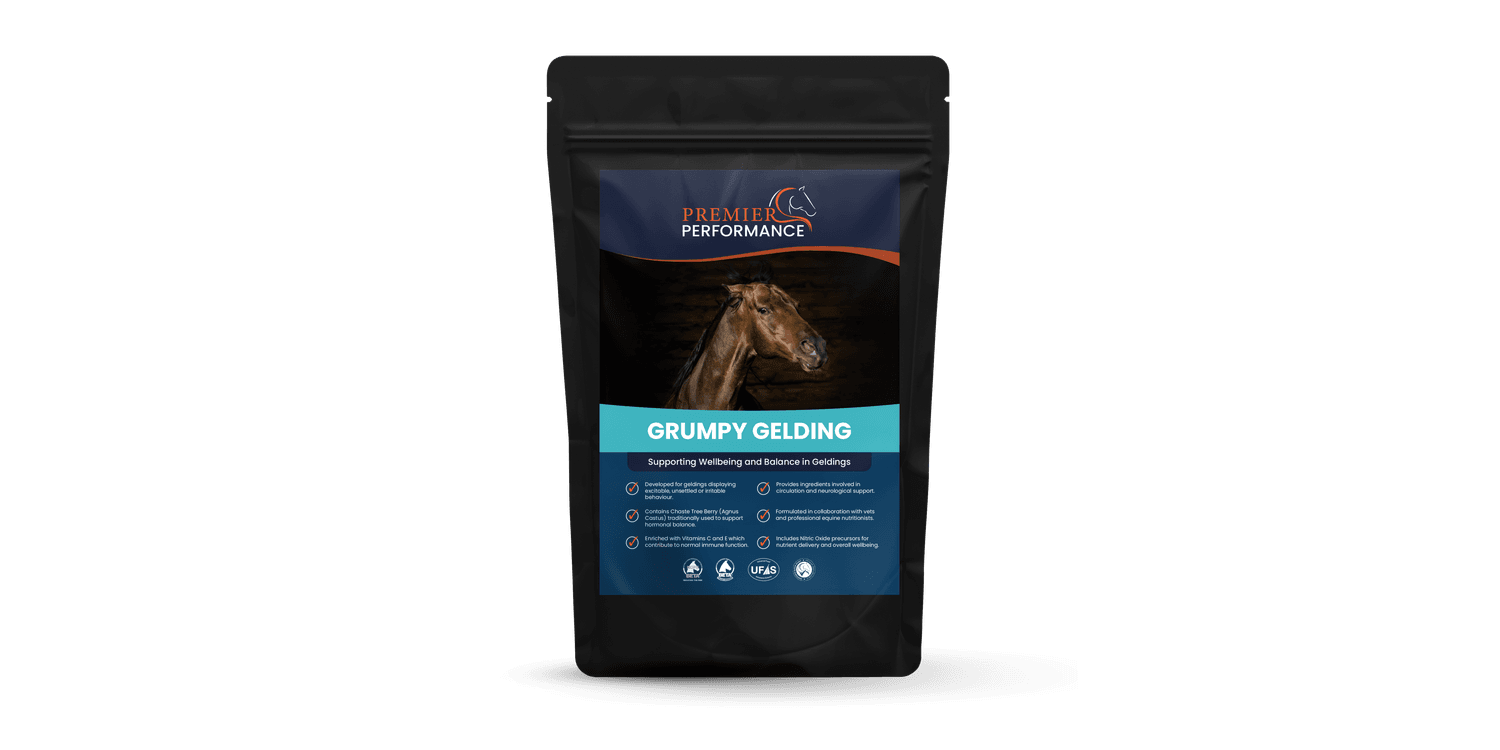 Grumpy Gelding is a carefully balanced complementary feed designed to support geldings to maintain a calm and composed demeanour. The formulation includes Chaste Tree Berry, known for its role in supporting normal hormonal activity, alongside L-Arginine which contribute to neurotransmitter production and neurological function.