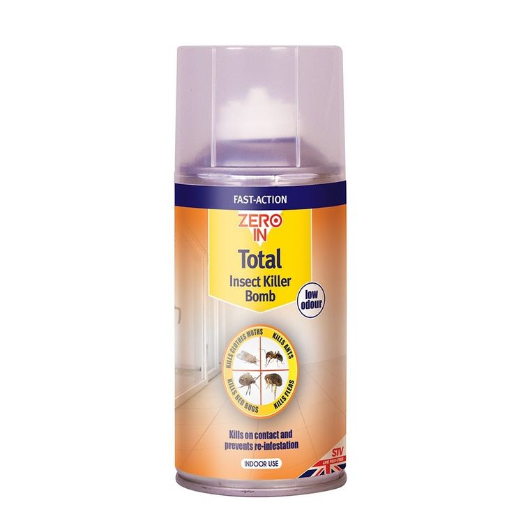 Zero In Total Insect Killer Bomb is an effective single shot insecticide spray for use against flying and crawling insect pests within the home. A single 150ml application will treat up to 150m2, reaching into cracks and crevices, and killing insects on contact.