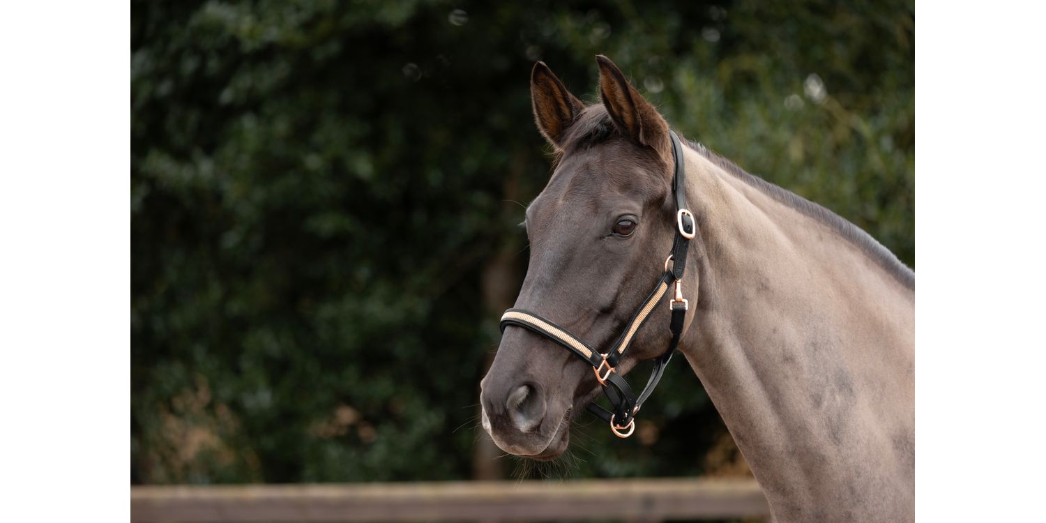 Encrusted with rose gold diamantes, this exquisite head collar will make your horse stand out from the crowd! The soft black leather is partnered with rose gold hardware for a fully coordinated look, featuring a fully adjustable headpiece, noseband and clip throat fastening.