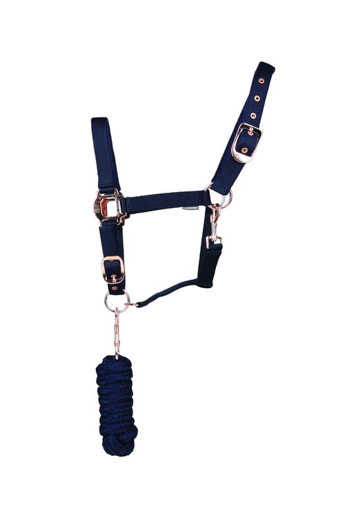 Hy Equestrian Rose Gold Head Collar & Lead Rope - Navy/Rose Gold