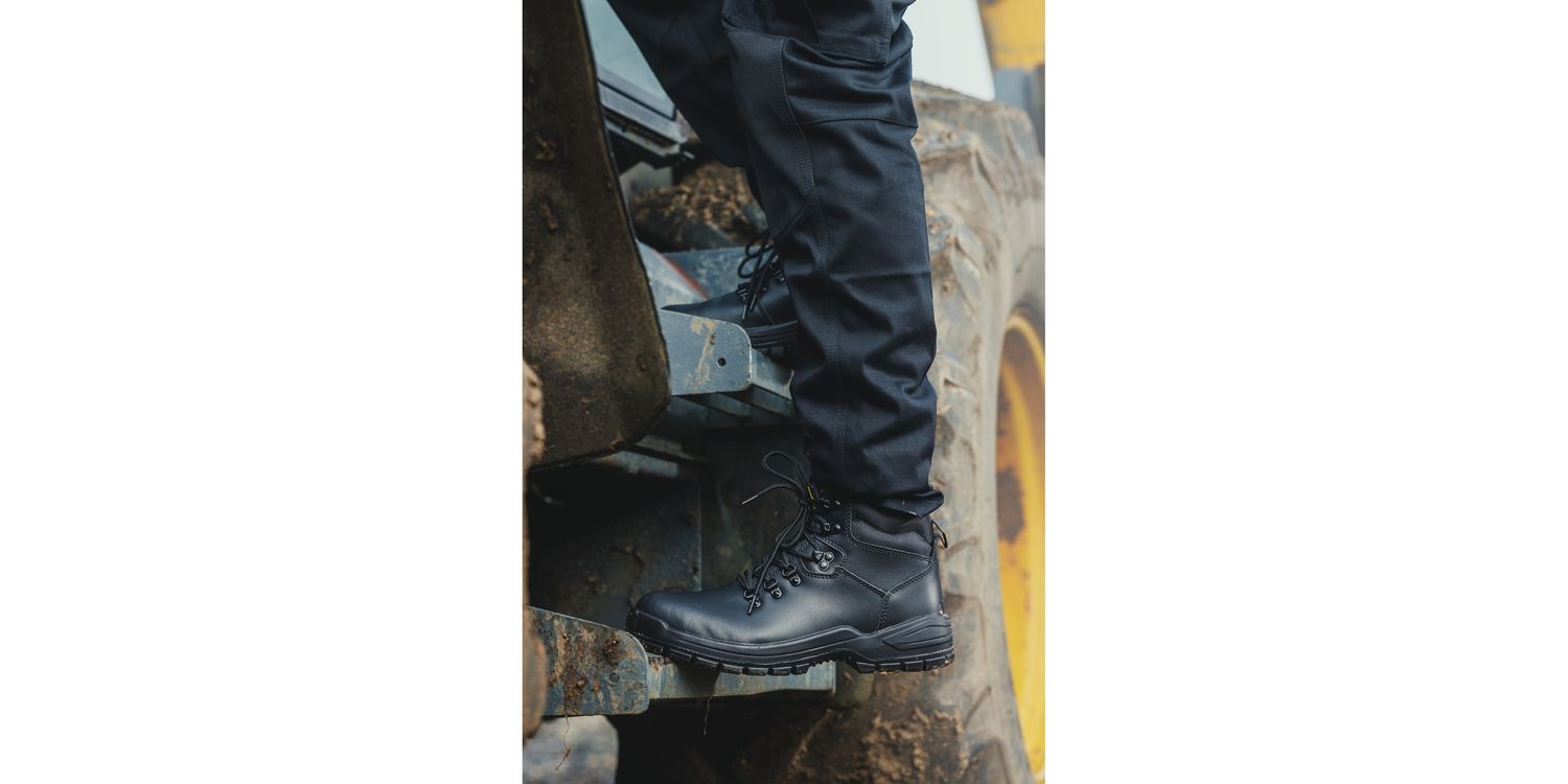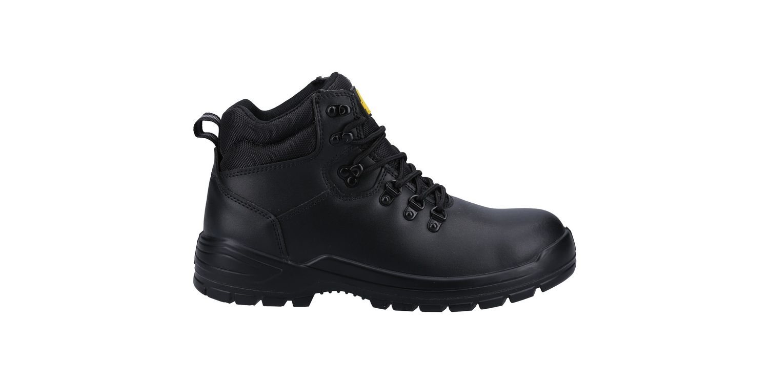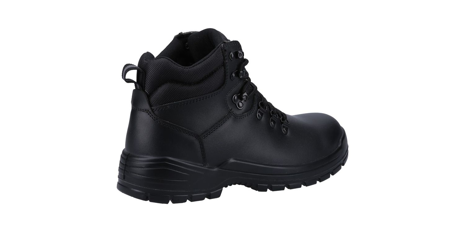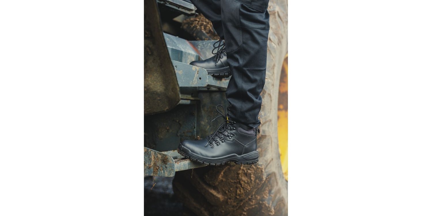 Lightweight and classic safety boot with water-resistant leather upper, padded collar, steel toe, steel midsole and dual density PU outsole.