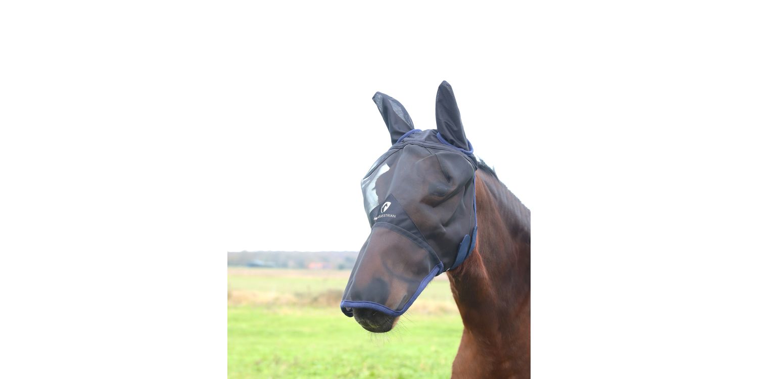 This fly mask will protect your horse or pony against flying insects, covering the ears, eyes and nose. Featuring eye darts to offer good clearance off the eyes and a fleece panel on the brow area, this fly mask won't rub the face and will be comfortable to wear all day long. The nose protection is ideal for those with sensitive skin and need extra protection and the breathable mesh ears make this a perfect mask for horses that get annoyed with flies buzzing in their ears. The touch tape fastenings secure the mask and make it easy to put on and take off.