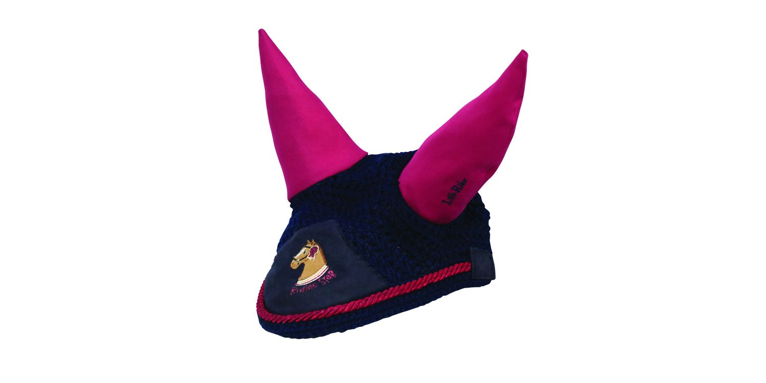Keep your horse or pony protected from the flies with the Riding Star Fly Veil. Made from a close knit crochet, this fly veil promotes maximum airflow to keep your horse cool and comfortable. The ears are made from a breathable, noise dulling fabric to combat any potential sound pollution. Featuring burgundy glitter binding and textured applique Riding Star horse on the half star shaped front. Matches the rest of the collection perfectly.
