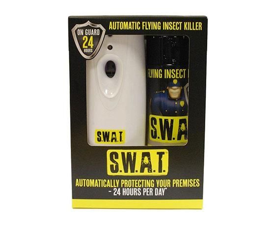 The SWAT automatic fly control system is battery powered so can be easily moved to where it is needed. The set contains an automatic dispenser and fly killer aerosol, working for over a month as a single refill.