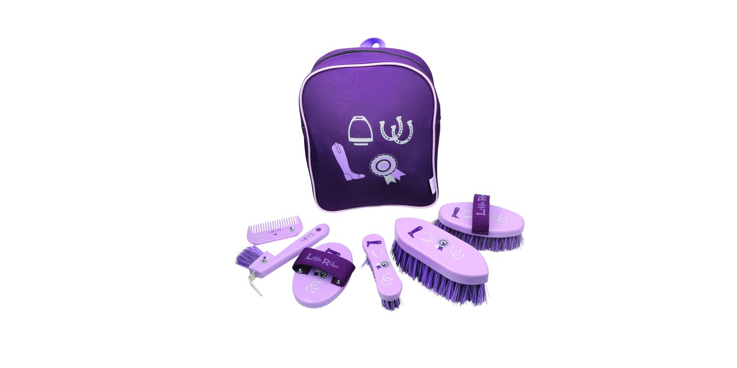 Add a touch of fun to your pony’s next pamper session with this handy grooming kit which is contained in a Giddy Up Gymkhana Rucksack. Durable and with adjustable straps and a hanging loop, it is perfect for transporting and storing the quality brushes. The gorgeous purple design on the front matches the rest of the collection perfectly. The set includes a face brush, dandy brush, body brush, curry comb, hoof pick and mane comb. Complete with matching piping and a secure zip.