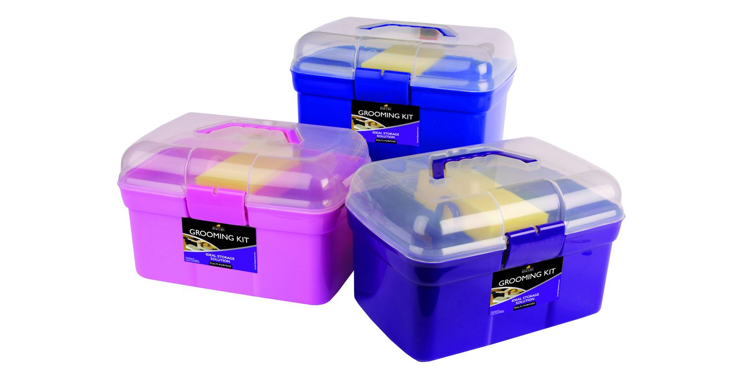 Includes: Hoof Oil Brush & Container, Dandy Brush, Body Brush, Sponge, Hoof Pick with Brush, Plastic Comb & Curry Comb.