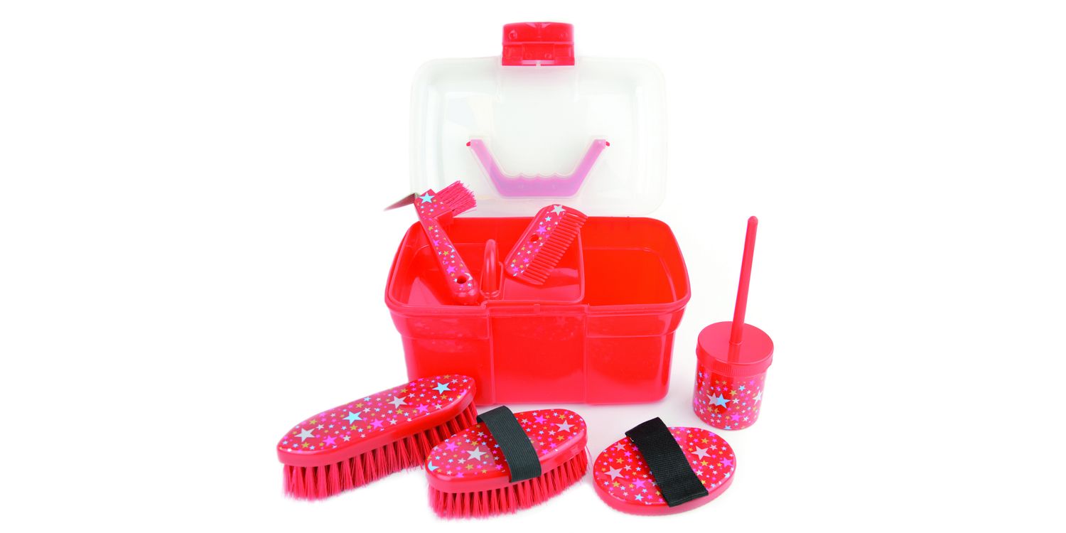 A stylish star patterned grooming kit idea for pony-mad children! Includes a Small Dandy Brush, Small Body Brush, Hoof Pick with Brush, Plastic Mane Comb, Plastic Comb and Hoof Oil Brush.