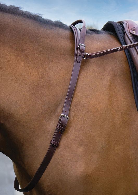 Two detachable straps fasten to the neck strap and clip to the saddle D-rings or the girth strap to ensure secure positioning and fit, finished with strong stainless-steel fittings for long-lasting performance.