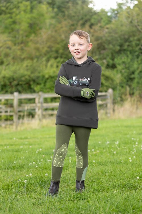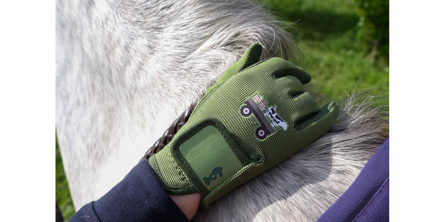 Part of the Farm Collection, these olive gloves with Amara grip palm have reinforced rein fingers to prevent rubbing, an elasticated cuff for a comfortable, secure fit and touch tape wrist straps for easy fastening. Featuring the tractor and trailer of animals on the back of the hand for a coordinated look.