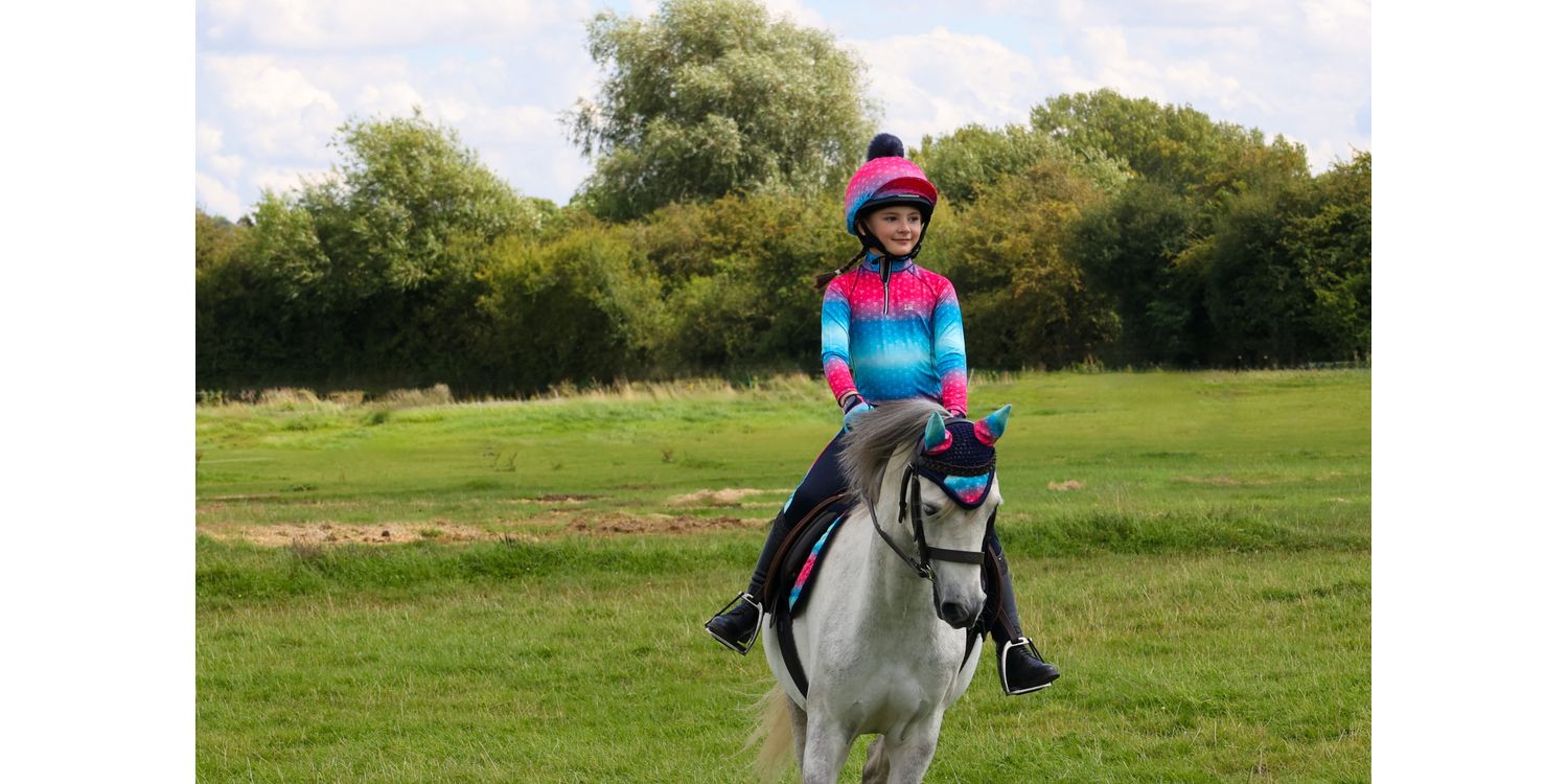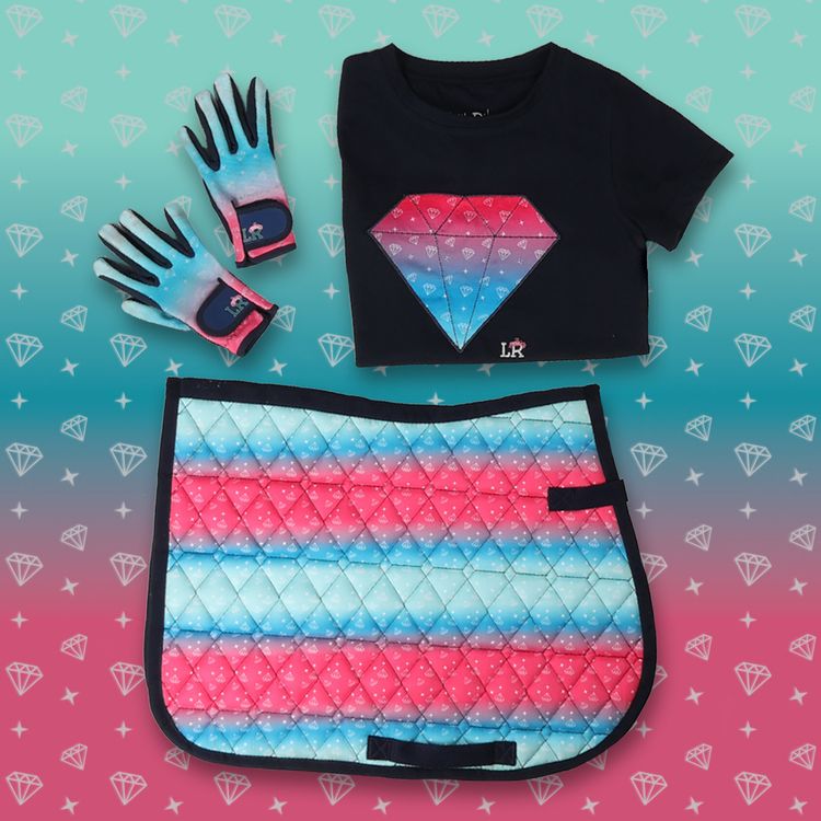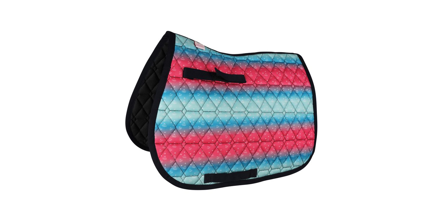 This vibrant saddle pad is part of the Dazzling Diamond range and is a must have addition to your saddle pad collection! The diamond quilted pad features the teal and pink ombre colouring and diamond print to stand out from the crowd and features navy binding. Matching navy girth loops ensure this pad is kept securely in place when under the saddle. Match with the rest of the collection for a fun pony and rider matchy style!