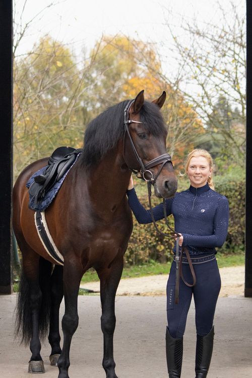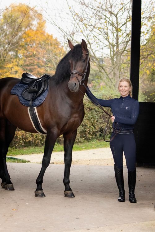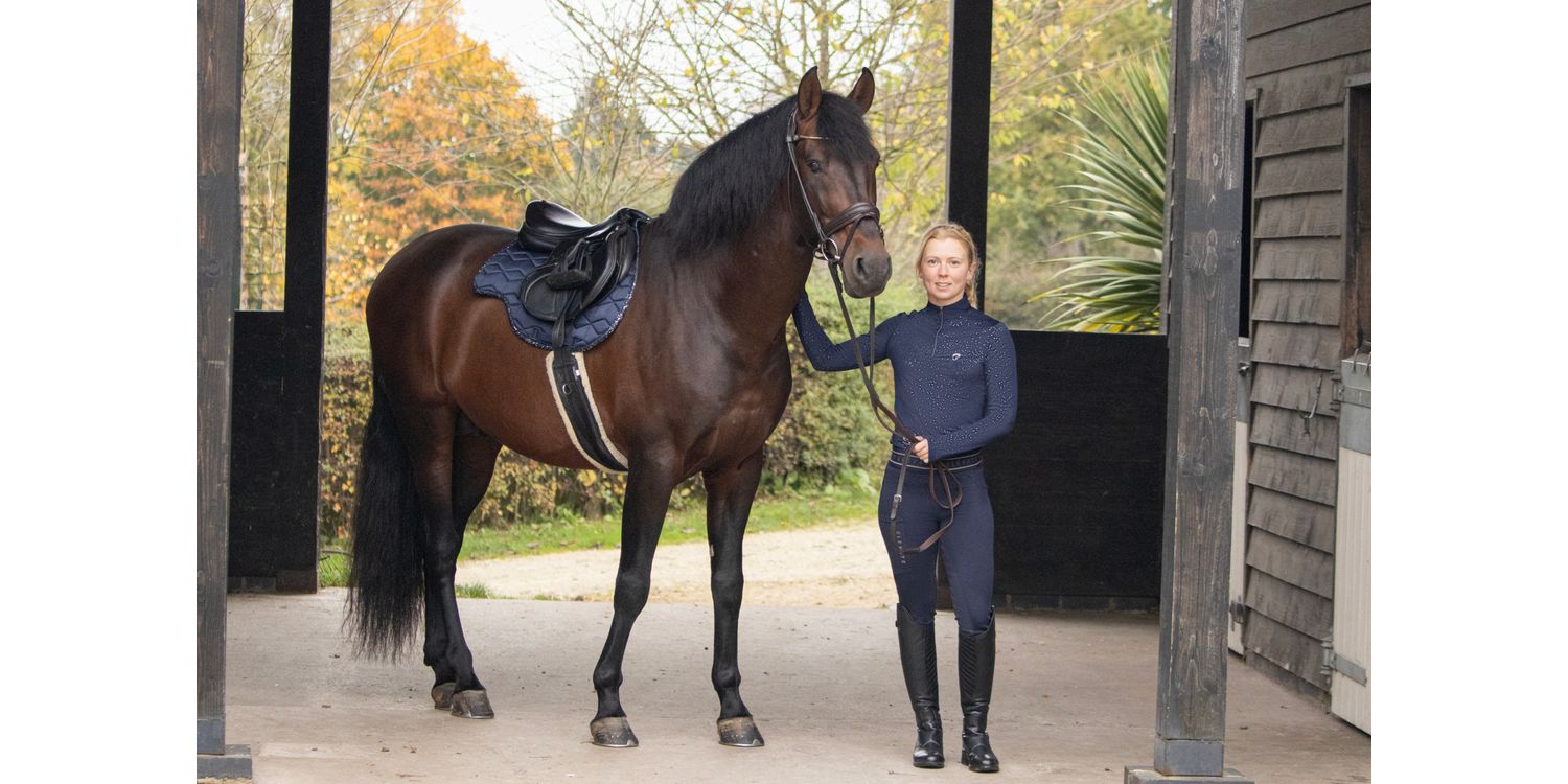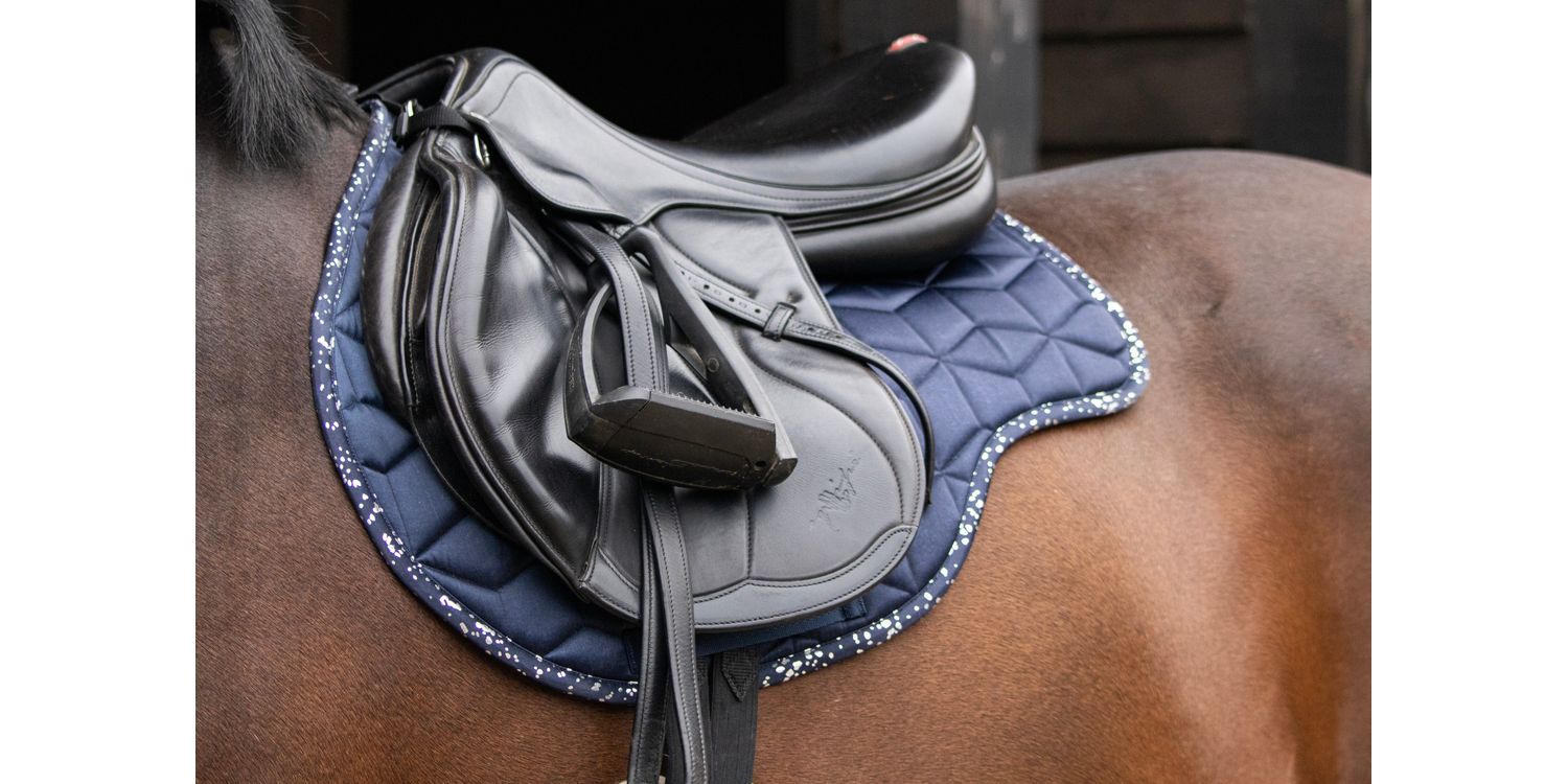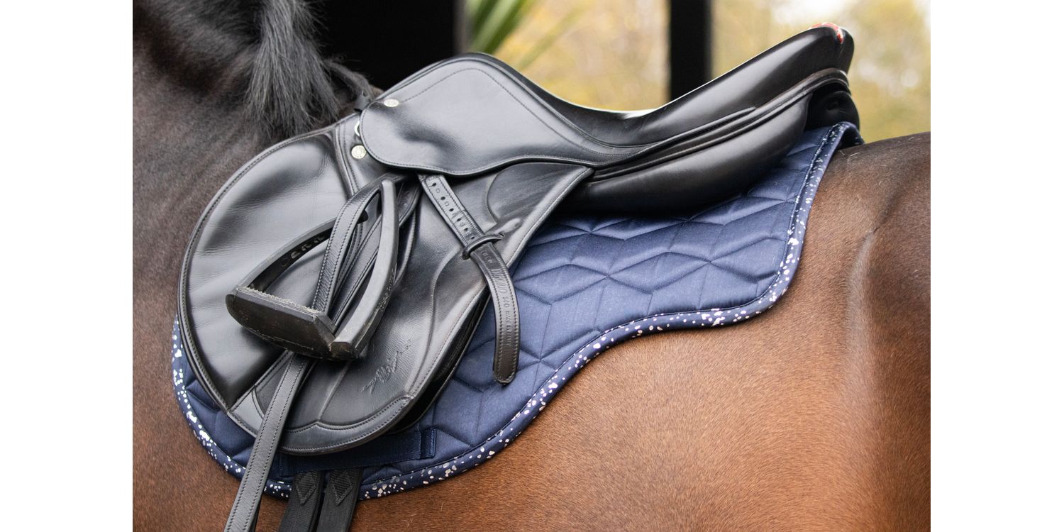 Create the ultimate stand-out style with the luxurious Elevate Allure Saddle Pad! Designed using a silky-smooth navy fabric, this close contact saddle pad is quilted and contoured to sit perfectly underneath your saddle, giving clearance at the withers and spine for optimum comfort. The sweat wicking lining optimises airflow to reduce excessive sweat build up on your horse. Coordinating girth loops help secure the pad in place. A striking gunmetal grey foil binding in a mottled design creates the perfect matchy look with the coordinating clothing available in the range.