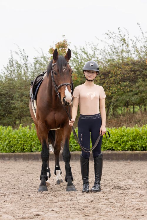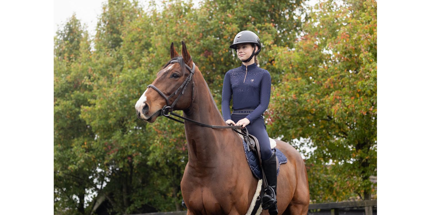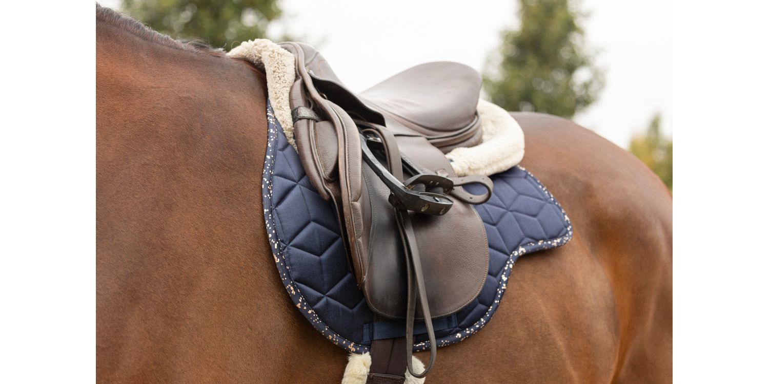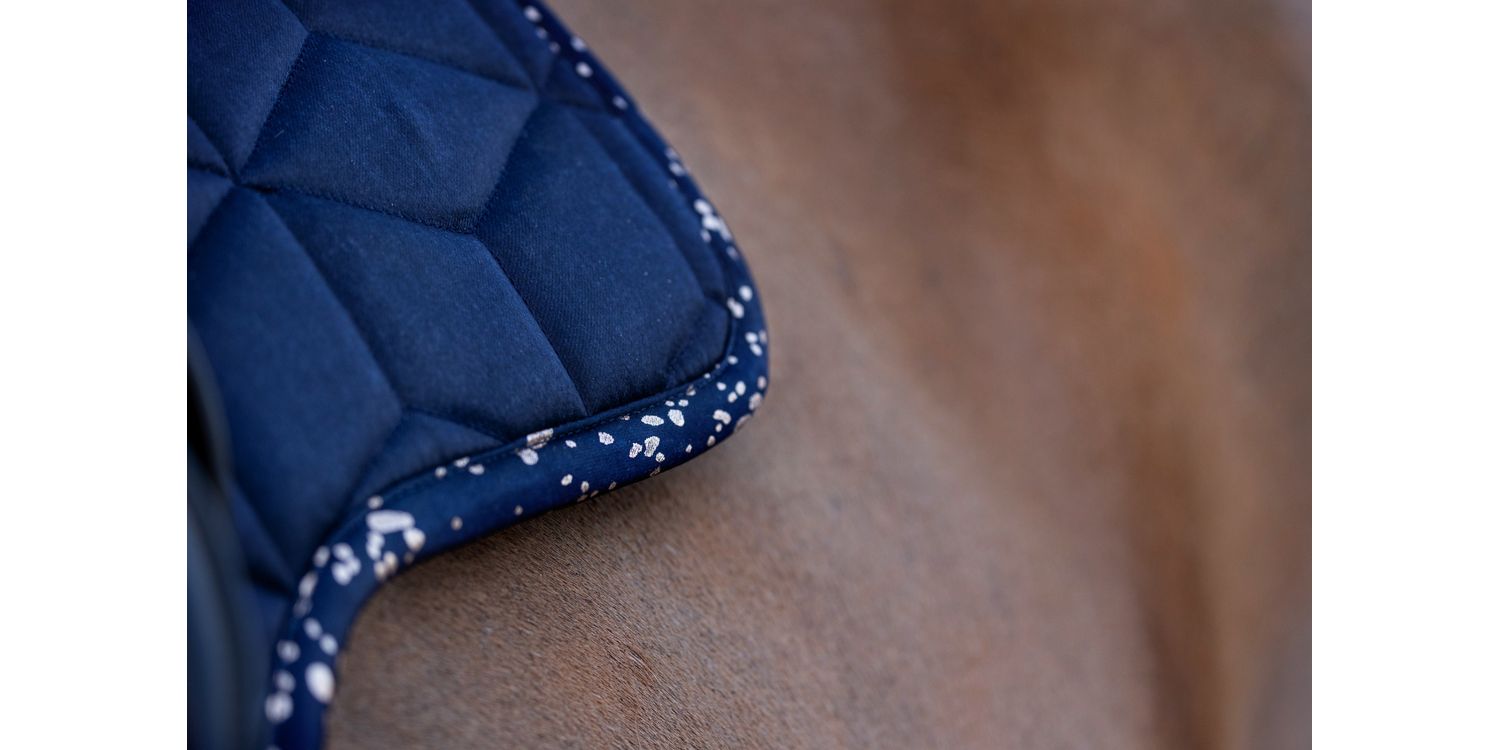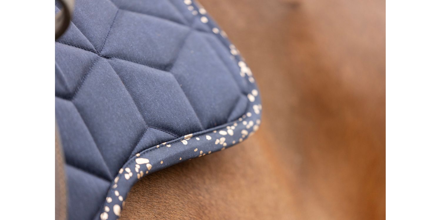 Create the ultimate stand-out style with the luxurious Elevate Allure Saddle Pad! Designed using a silky-smooth navy fabric, this close contact saddle pad is quilted and contoured to sit perfectly underneath your saddle, giving clearance at the withers and spine for optimum comfort. The sweat wicking lining optimises airflow to reduce excessive sweat build up on your horse. Coordinating girth loops help secure the pad in place. A striking rose gold foil binding in a mottled design creates the perfect matchy look with the coordinating clothing available in the range.