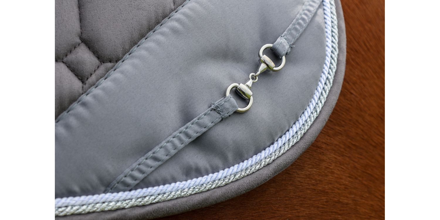 This gorgeous saddle pad is a must have addition to your collection. Made from a luxurious suede material with mesh lining to promote breathability, this saddle pad is designed for performance. The pad features a silk corner with metal silver bit, girth straps, high wither design and small diamond stitch quilting for functionality and style.