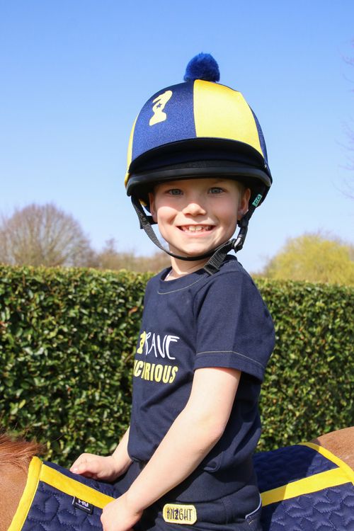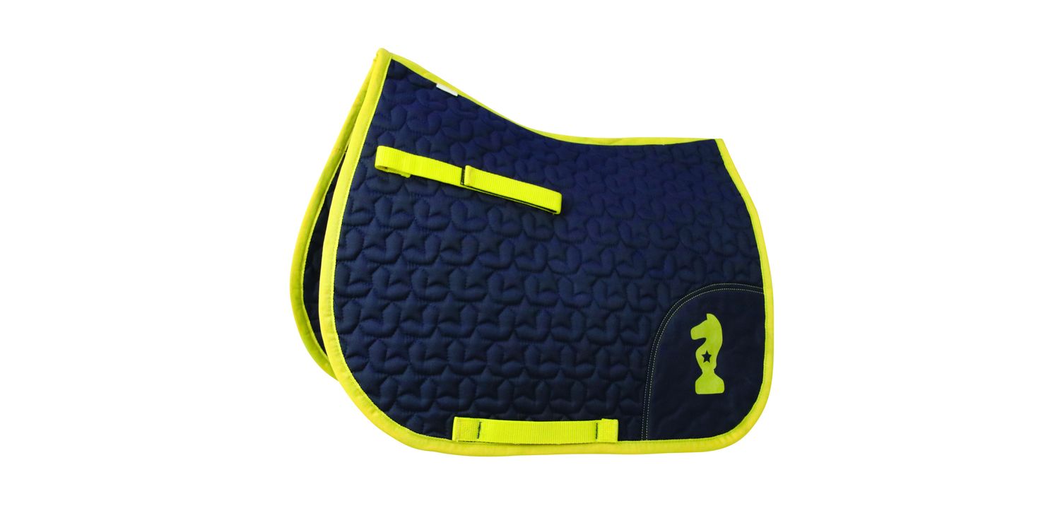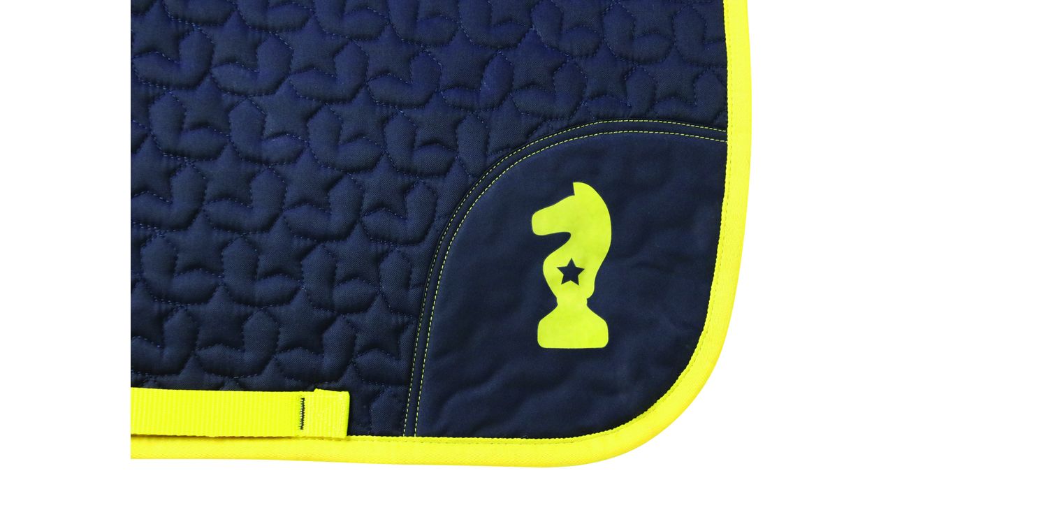This funky, navy star quilted saddle pad with contrasting yellow stitching and piping features the Little Knight emblem. A yellow girth strap and touch tape straps on both sides of the saddle pad help hold it securely in place. Finished with a woven Little Knight label on the spine. Pair with the matching fly veil for a smart look.