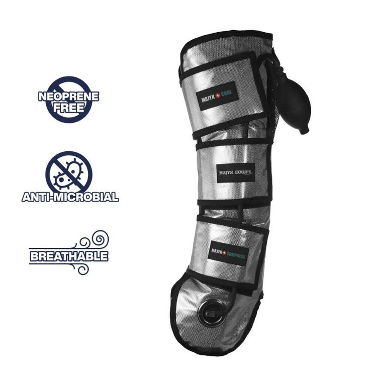 The Majyk Equipe Ice Boots offer advanced cooling and compression for optimal equine recovery. Designed with an extra-long gel insert, they provide superior coverage while remaining soft and comfortable on the horse’s legs. The compression feature helps reduce inflammation, while the reflective NASA-approved outer layer keeps the boots colder for longer, even in direct sunlight.